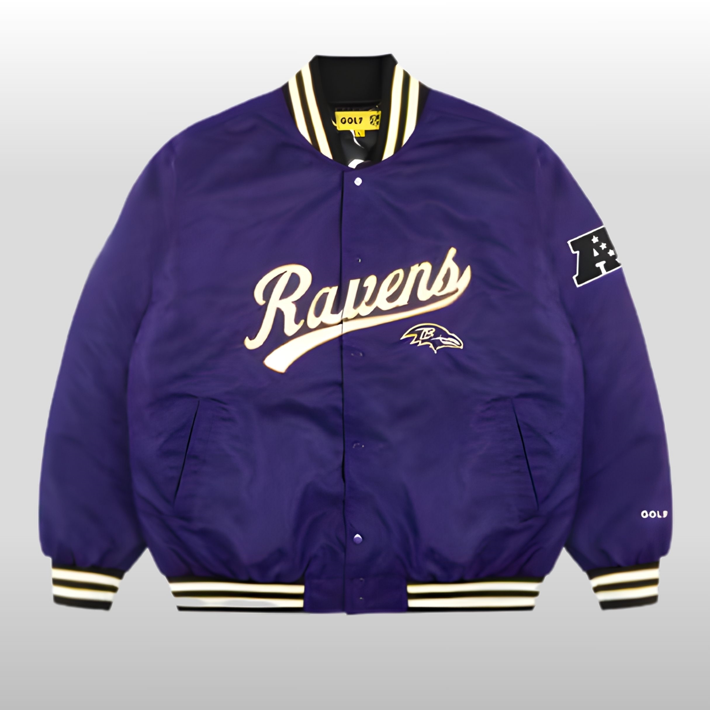 The 2025 Baltimore Ravens By GOLF Purple Jacket is a luxurious, satin-finish varsity jacket drenched in the iconic purple hue of the team. This exclusive piece features the word “Ravens” elegantly scripted across the chest in a bold, contrasting color, subtly underlined by the team’s sleek logo. The classic varsity silhouette is defined by striking black and white striped rib-knit collars, cuffs, and waistband, offering a timeless aesthetic. A prominent ‘A’ logo patch adorns the left sleeve, while subtle GOLF branding is featured near the hem, signifying its unique design collaboration.
