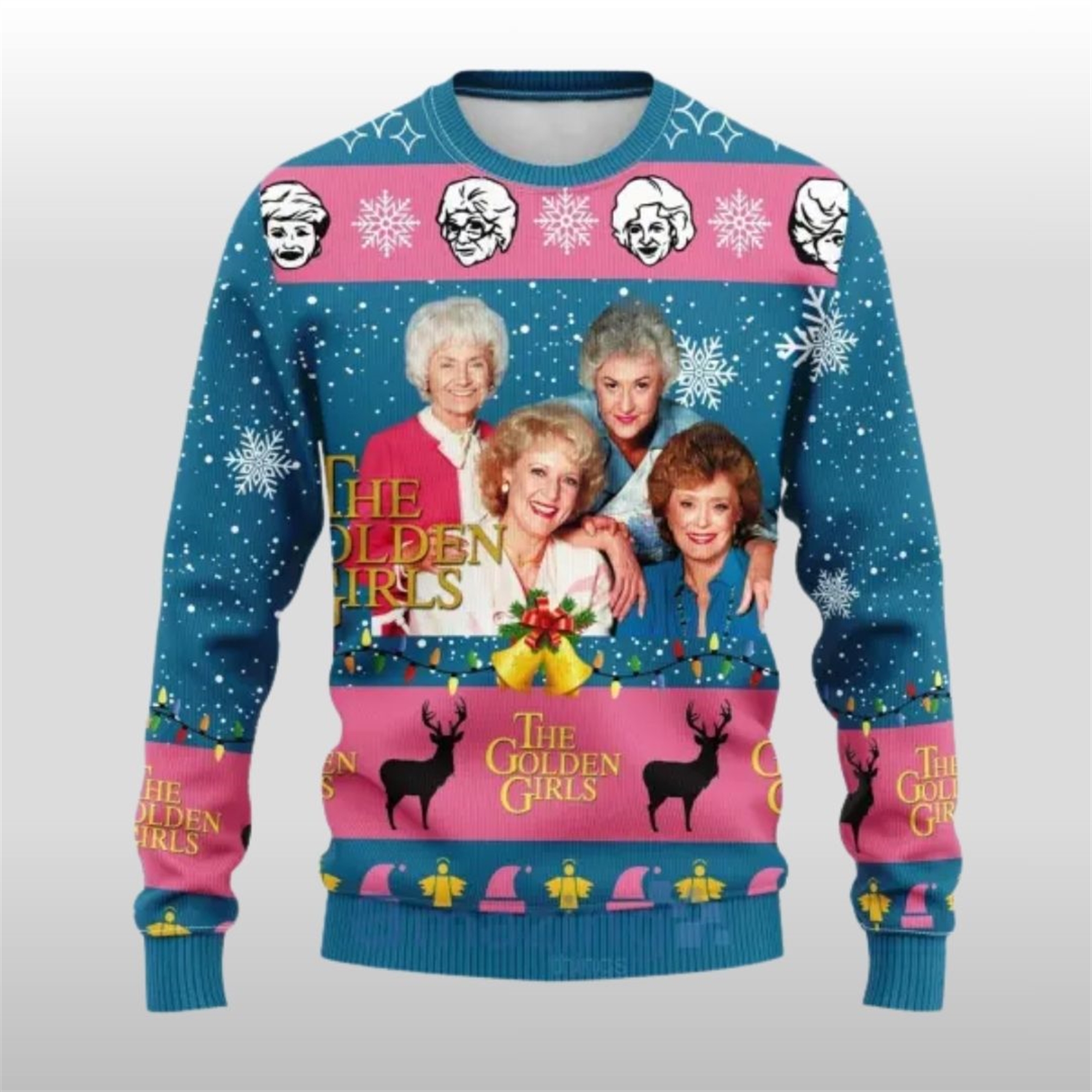 This vibrant blue crew-neck sweater is a sight to behold! Dominating the center are the beloved faces of Dorothy, Rose, Blanche, and Sophia, framed by twinkling Christmas lights and falling snow. The blue backdrop is complemented by pink horizontal bands featuring bold “THE GOLDEN GIRLS” text, cheerful reindeer silhouettes, festive snowflakes, and charming character portraits. It’s warm, cozy, and designed to deliver maximum laughs and nostalgic feels. The blue and pink palette, paired with the iconic cast, makes this the perfect statement piece for any holiday celebration, ensuring you embody the spirit of fun and friendship all season long.