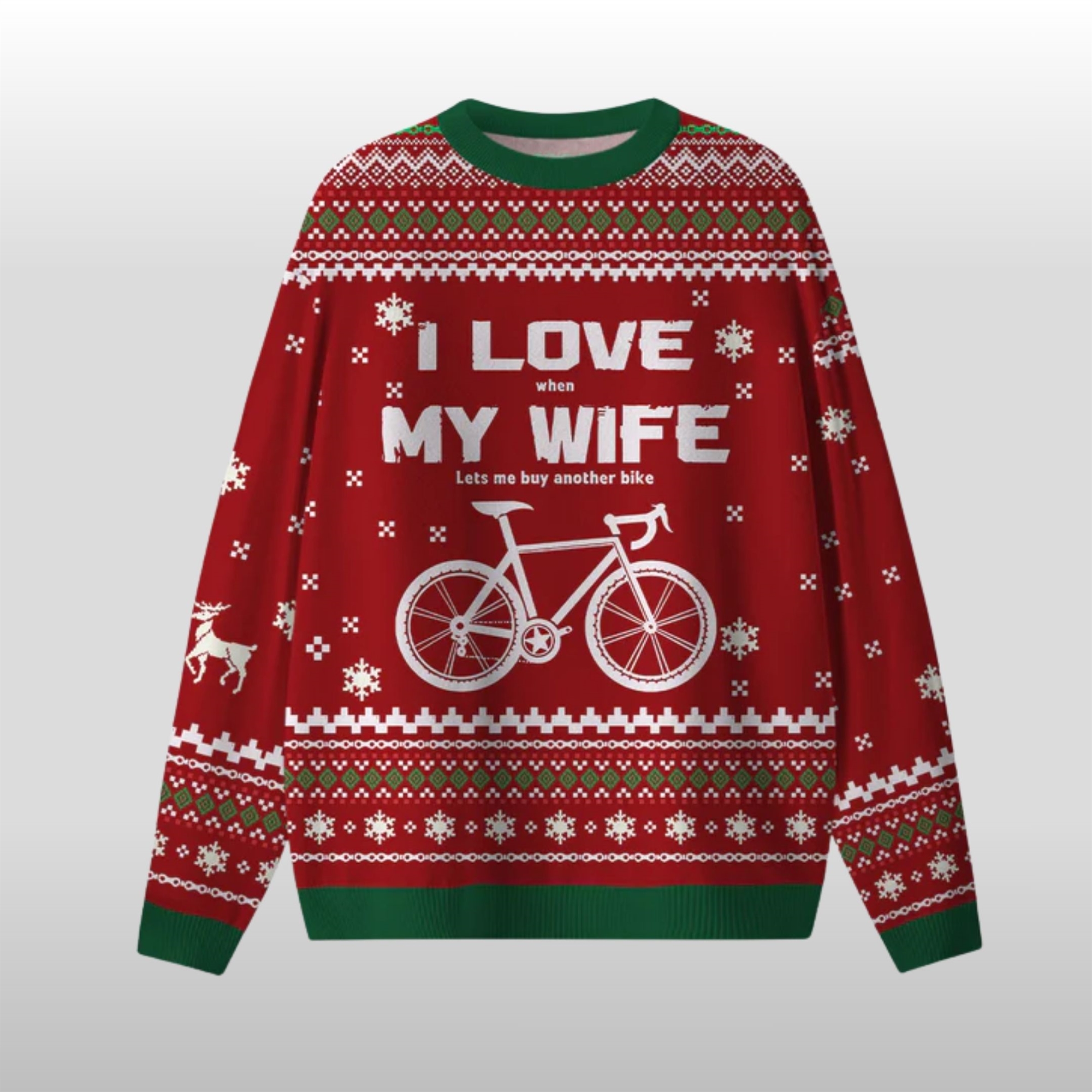 The 2025 Christmas I Love When My Wife Lets Me Buy Another Bike Ugly Sweater is the quintessential festive garment for anyone who considers cycling a way of life. This vibrant red sweater features a classic ugly Christmas pattern with white snowflakes, green and white trim, and charming reindeer accents. The center stage belongs to the bold, white text that reads, “I LOVE when MY WIFE Lets me buy another bike,” centered above a detailed graphic of a road bicycle. It’s the perfect blend of holiday spirit and relatable cyclist humor.