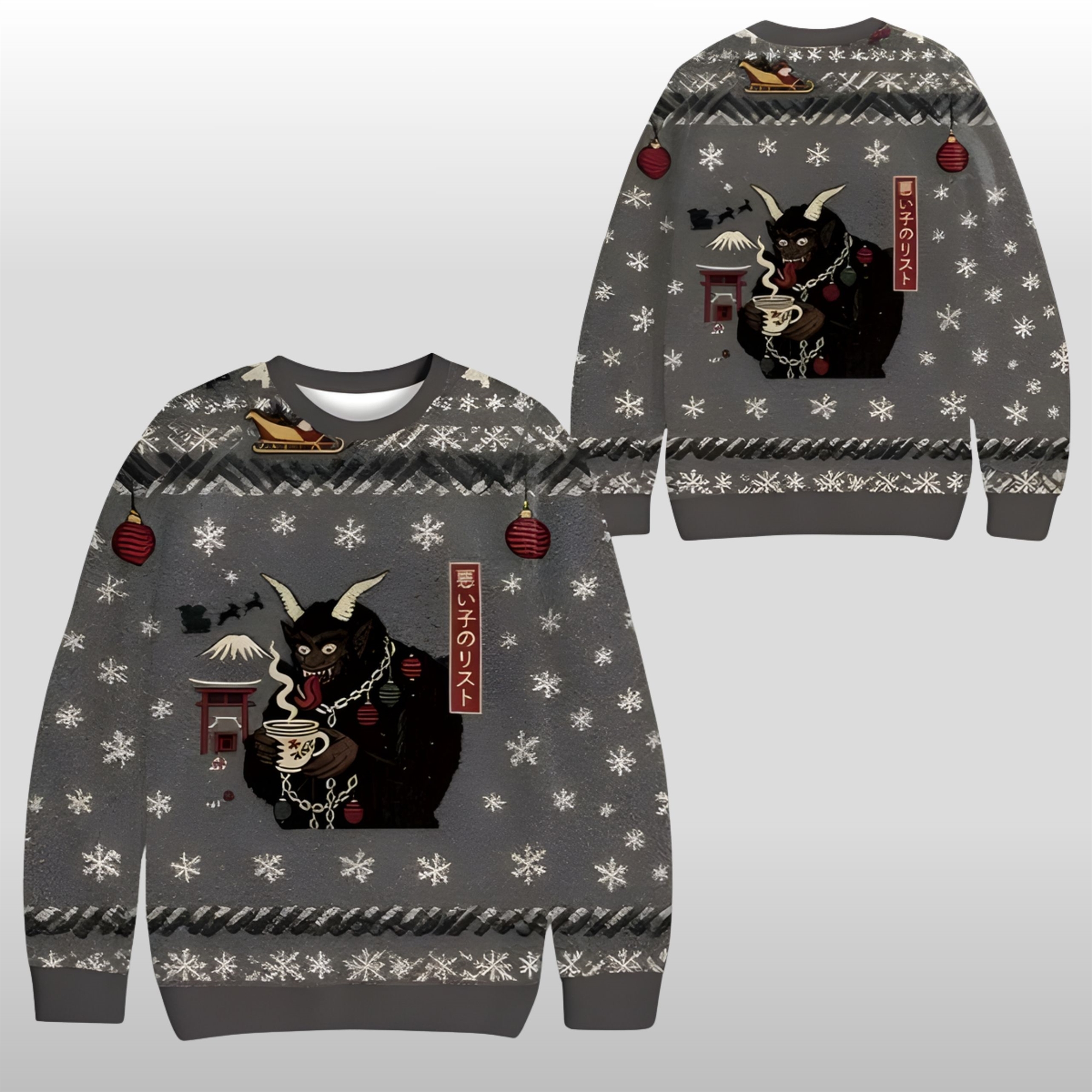 Embrace the anti-Santa spirit with this striking, high-quality knitted-style ugly sweater. The central design features a fierce, horned Krampus—the Yuletide beast—sitting amid a snowy, traditionally Japanese-inspired landscape, complete with a torii gate and Mount Fuji in the distance. He is menacingly chained, holding a steaming cup, perhaps of the tears of bad children, with the Japanese text for “Naughty List” (悪い子のリスト) displayed prominently in a red vertical panel. The design is framed by classic winter motifs: snowflakes, holiday ornaments, and a border of geometric patterns, while a sleigh pulled by Krampus’s dark shadow flies across the shoulders.