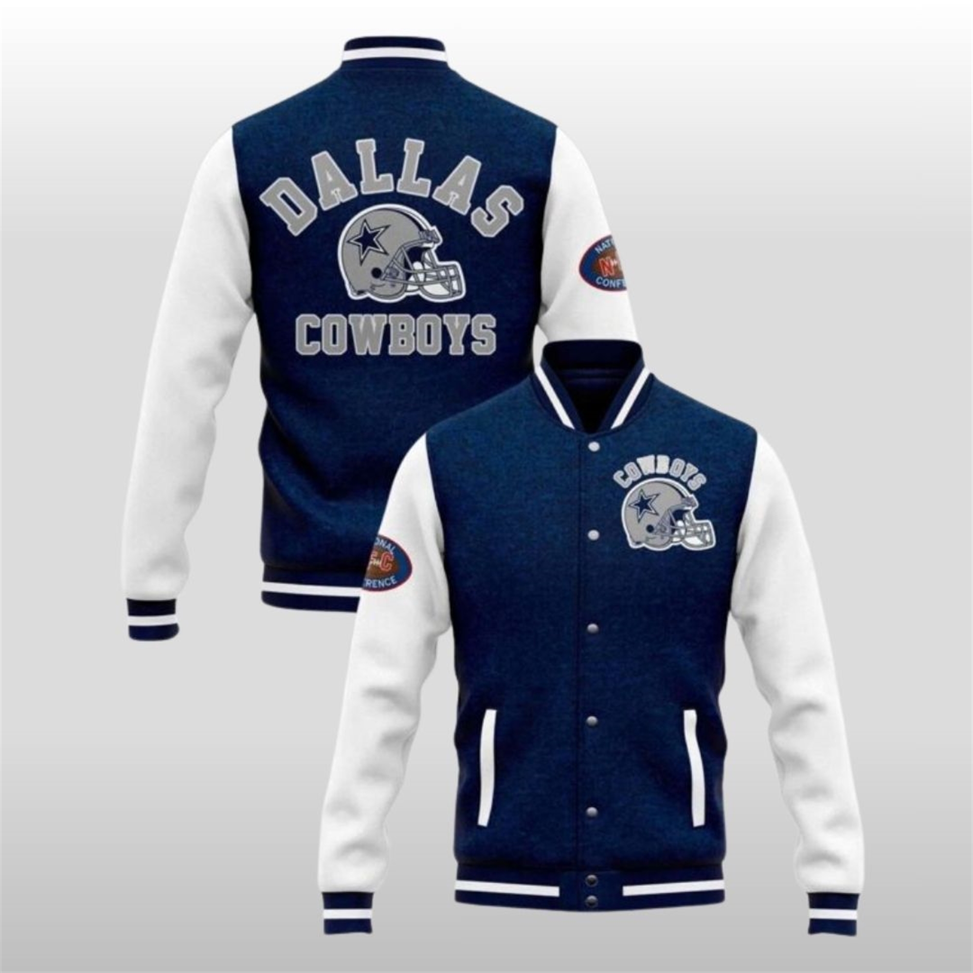 Turn around, and the back makes an even stronger statement, featuring the words “DALLAS COWBOYS” arched above and below the prominent helmet graphic. Rib-knit cuffs and hem with navy and white stripes ensure a comfortable, snug fit while enhancing the sporty appeal. This premium varsity jacket is a must-have piece for any collector or dedicated supporter, blending musical star power with legendary team pride.