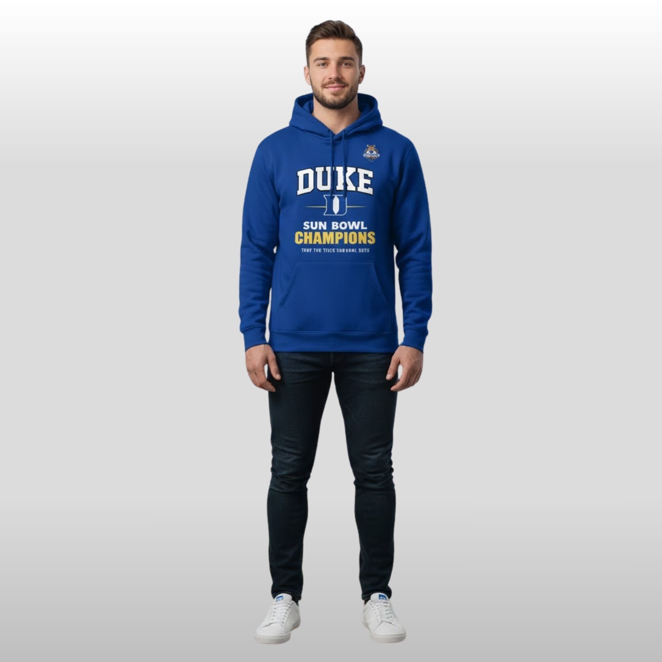 The front prominently features the bold “DUKE” block lettering above the iconic “D” logo, anchored by the “SUN BOWL CHAMPIONS” title in striking gold and white text. To add a unique touch, the official event logo sits on the upper chest. The back of the garment makes a statement with a stylized script “Duke” entwined with a classic pitchfork graphic, ensuring you look like a winner from every angle.