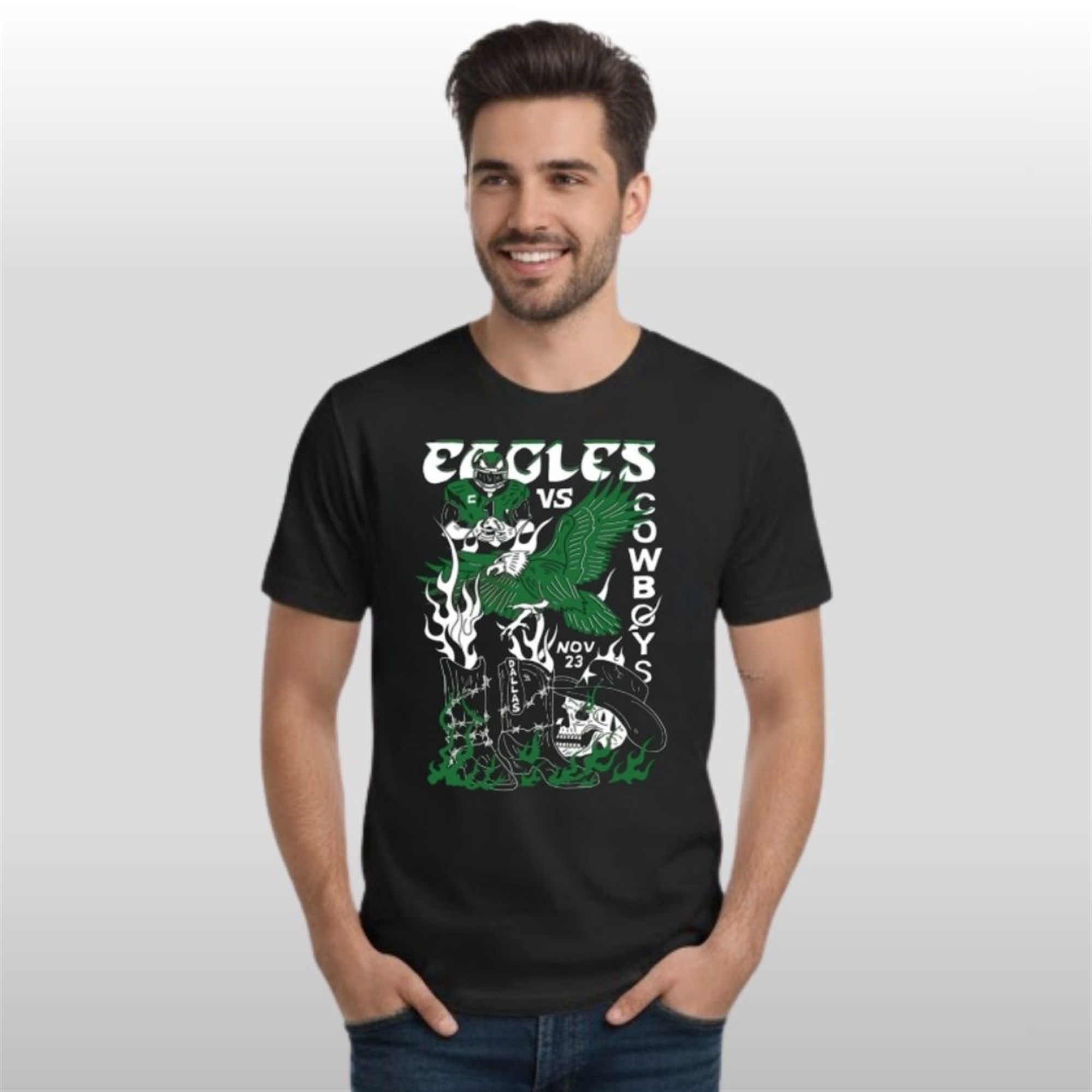 Get ready to dominate the fan game with the 2025 Eagles Showdown in Dallas Shirt—the perfect way to honor the intense Philadelphia-Dallas rivalry. This black tee features a striking, bold graphic, mixing a rock-and-roll edge with the fierce spirit of the game. At the top, “EAGLES VS COWBOYS” frames a menacing, skull-faced figure wearing an Eagles helmet, embodying the team’s ruthless determination. A detailed eagle soars mid-design, and below, a burning landscape showcases a second skull wearing a cowboy hat, representing the opposing side. The key date, NOV 23, is prominently displayed, marking the epic confrontation. This powerful design, a true piece of Eagles vs. Cowboys rivalry apparel, captures the raw aggression and passion of the biggest yearly matchup, making it essential wear for any devoted supporter.
