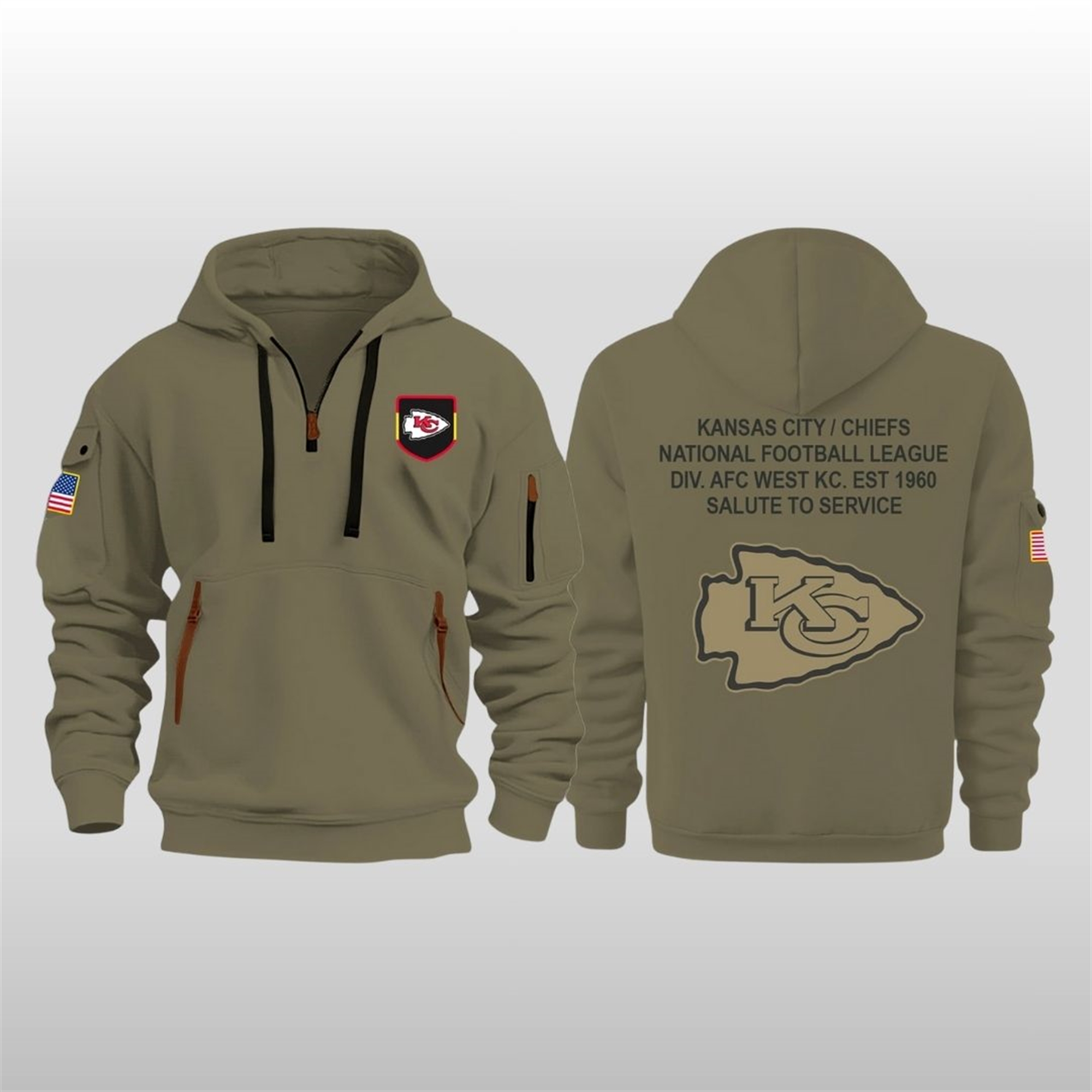 The 2025 Kansas City Chiefs Salute to Service Hoodie is more than just cold-weather gear; it’s a bold statement of support and team pride. Crafted in a rugged, military-inspired olive drab (or “khaki”) color, this pullover features a modern, tactical look.
