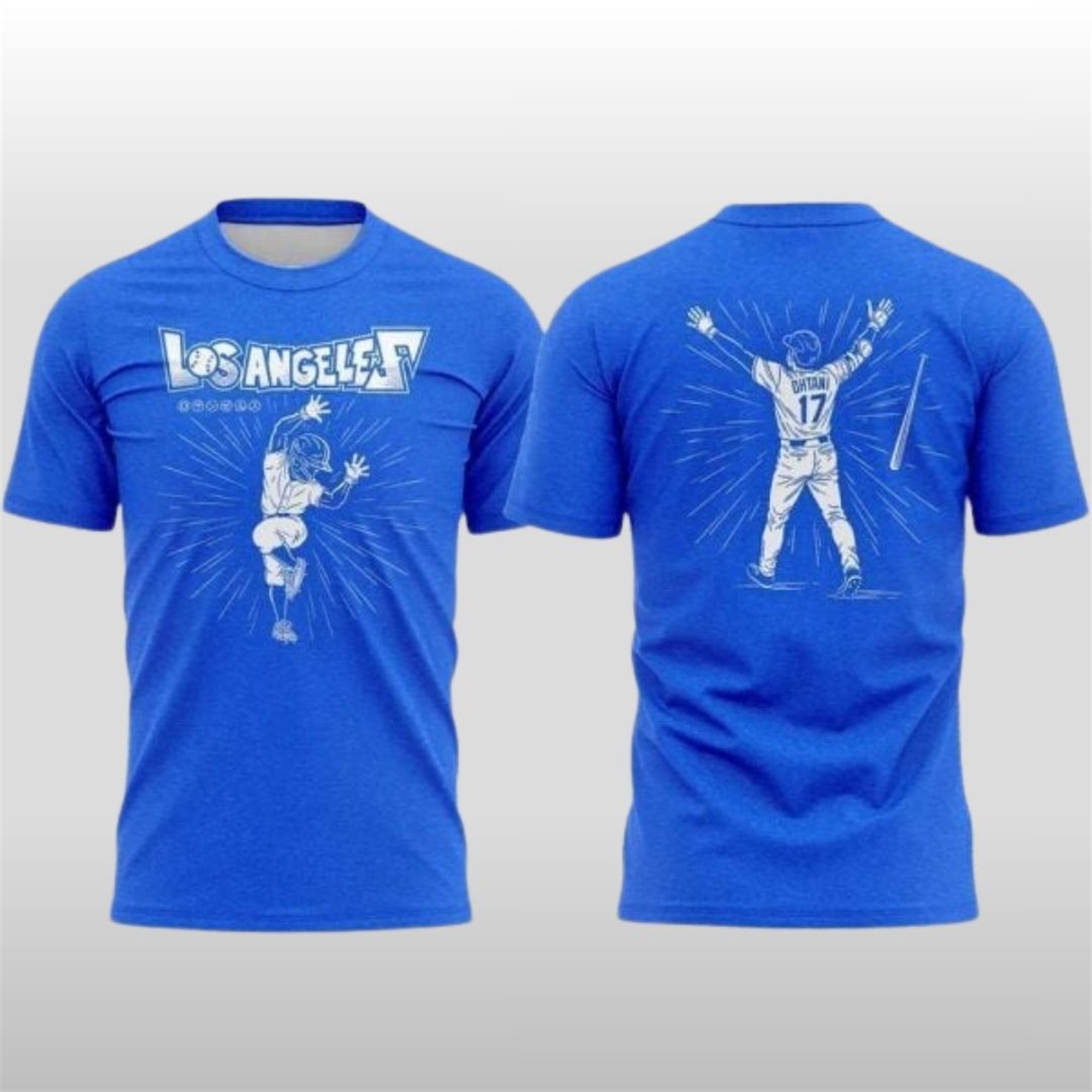 The front of the shirt features a striking, stylized graphic of a player mid-celebration, capturing the intense, balanced motion associated with the team’s “hip lock” move after a successful play. The back is equally iconic, showcasing Ohtani in his familiar Dodgers No. 17 jersey, arms raised in triumph and surrounded by a radiant burst graphic. This visual spectacle immortalizes a signature moment in the 2025 season, making it a must-have for any dedicated fan looking for unique LA Dodgers Shohei Ohtani Anime Graphic Shirt