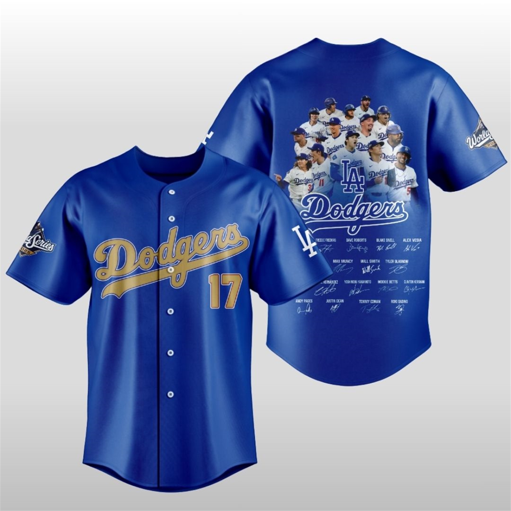 The back is a stunning tribute to the championship squad, showcasing a vibrant, high-quality graphic of the entire winning team celebrating their victory. Below the image, the signatures of the championship roster—including Freddie Freeman, Mookie Betts, Shohei Ohtani, and more—are beautifully printed, transforming the jersey into a wearable piece of sports history. Wearing this jersey connects you directly to the passion, the pride, and the emotional rush of a champion. This is more than apparel; it’s a statement of ultimate fan loyalty, celebrating the Dodgers’ dominance in the 2025 season.
