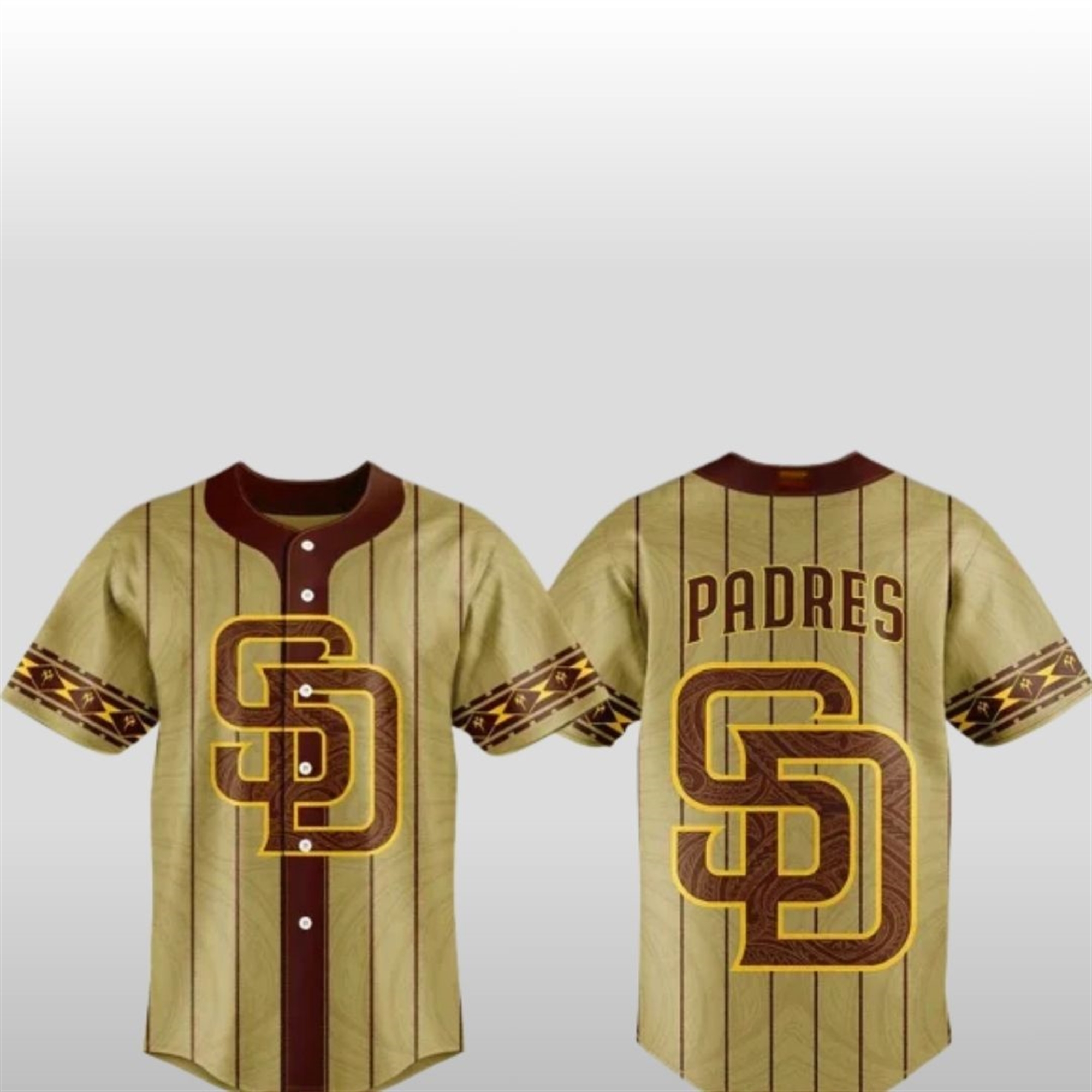 The front proudly displays the iconic “SD” logo in a rich, textured brown and gold outline. On the reverse, the “PADRES” name is arched above the large, stylized “SD” logo, matching the front’s captivating design. The sleeves boast a distinctive, repeating geometric pattern in warm gold and brown—a subtle nod to traditional Pacific Islander motifs and artistry.