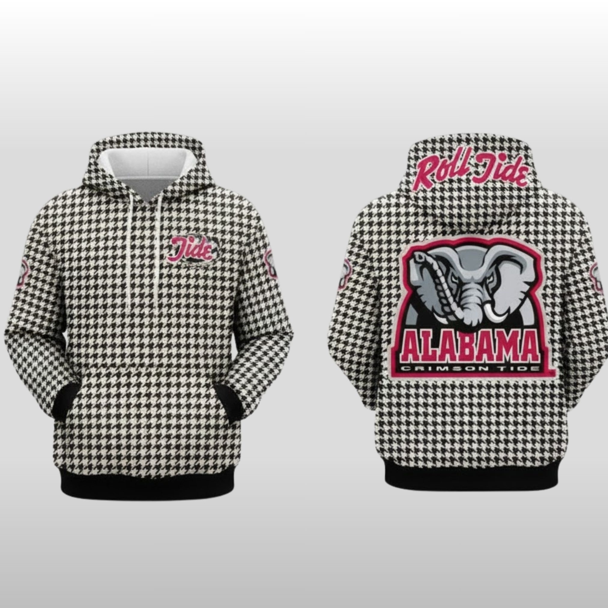 The hoodie features an all-over black and white houndstooth print, a timeless pattern synonymous with greatness in Southern football history. On the front, a stylized “Tide” script sits prominently on the chest. The back is the true showstopper, featuring a massive, high-definition graphic of the iconic elephant mascot framed by a vibrant crimson border and the bold “ALABAMA” lettering. This Houndstooth Fan Apparel has gone trending because it perfectly bridges the gap between vintage tradition and contemporary street style.