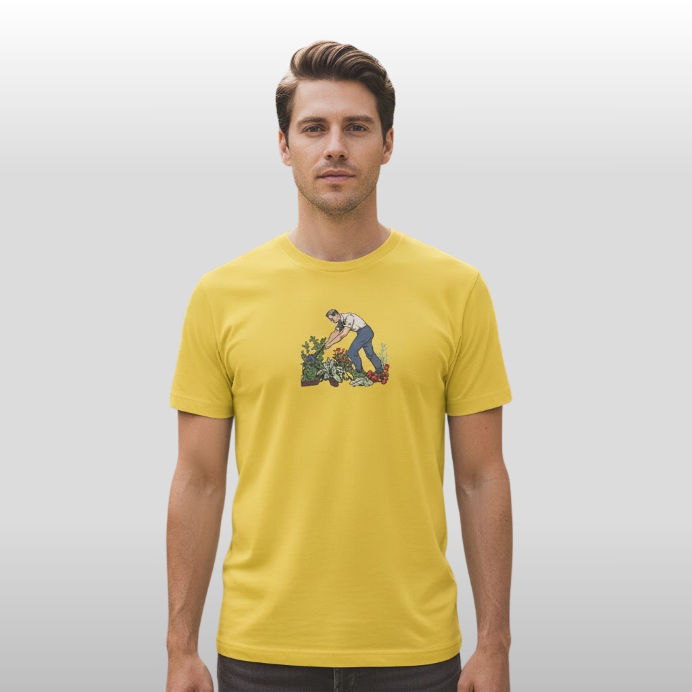 The 2026 Alexander Skarsgard SNL Shirt is a lesson in “less is more.” Moving away from loud, busy graphics, this shirt embraces a vibrant, sun-drenched yellow palette that radiates energy. The centerpiece is a unique, hand-drawn illustration featuring a serene gardening scene, capturing a moment of quiet focus that contrasts beautifully with the high-energy atmosphere of live television.