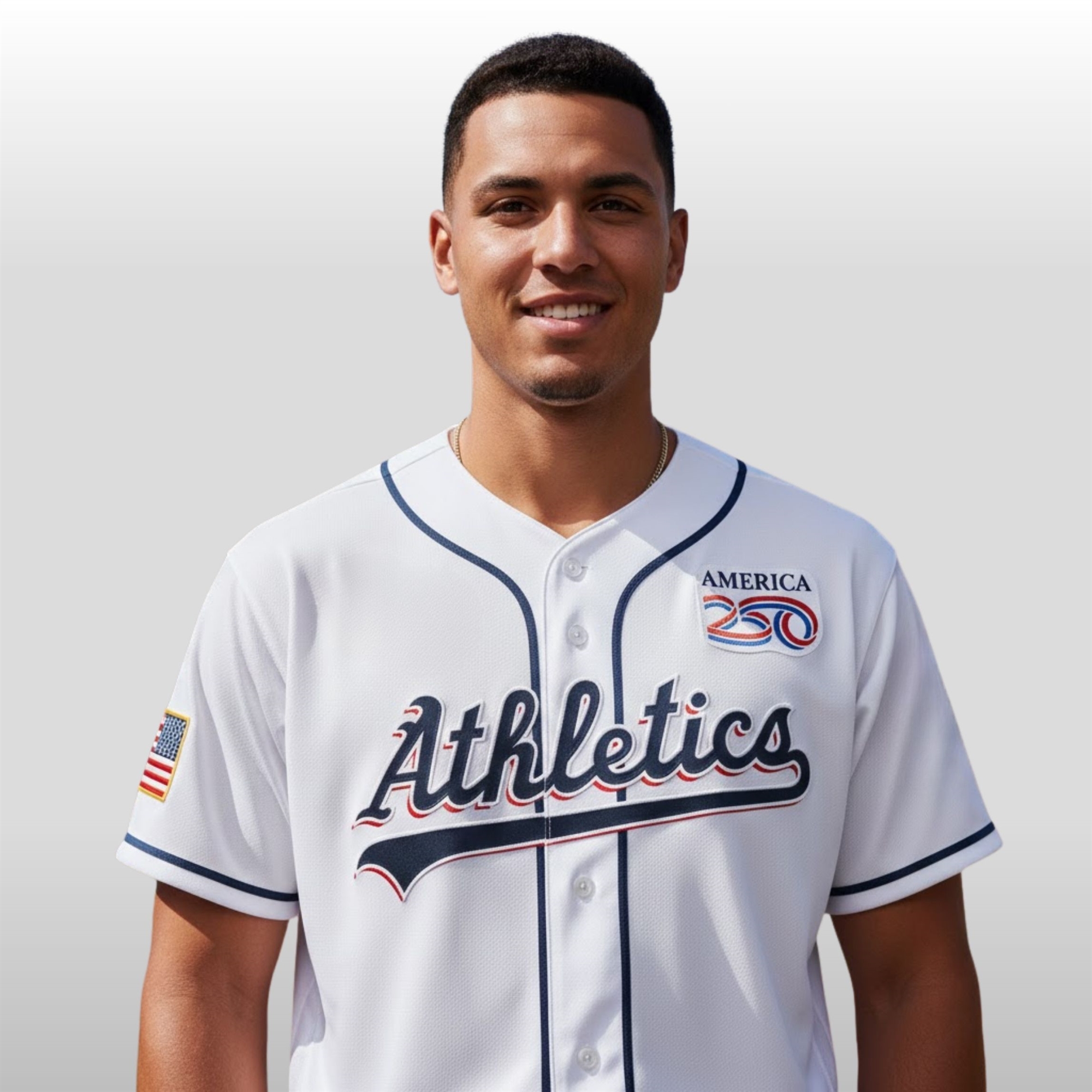 The jersey features a clean, classic white base that allows the patriotic details to shine. The front showcases the iconic “Athletics” script in a deep navy blue, accented with red and silver outlines that evoke a sense of prestige. On the sleeve, a specially designed “America 250” patch is displayed, marking this as a true collector’s item for the 2026 season.