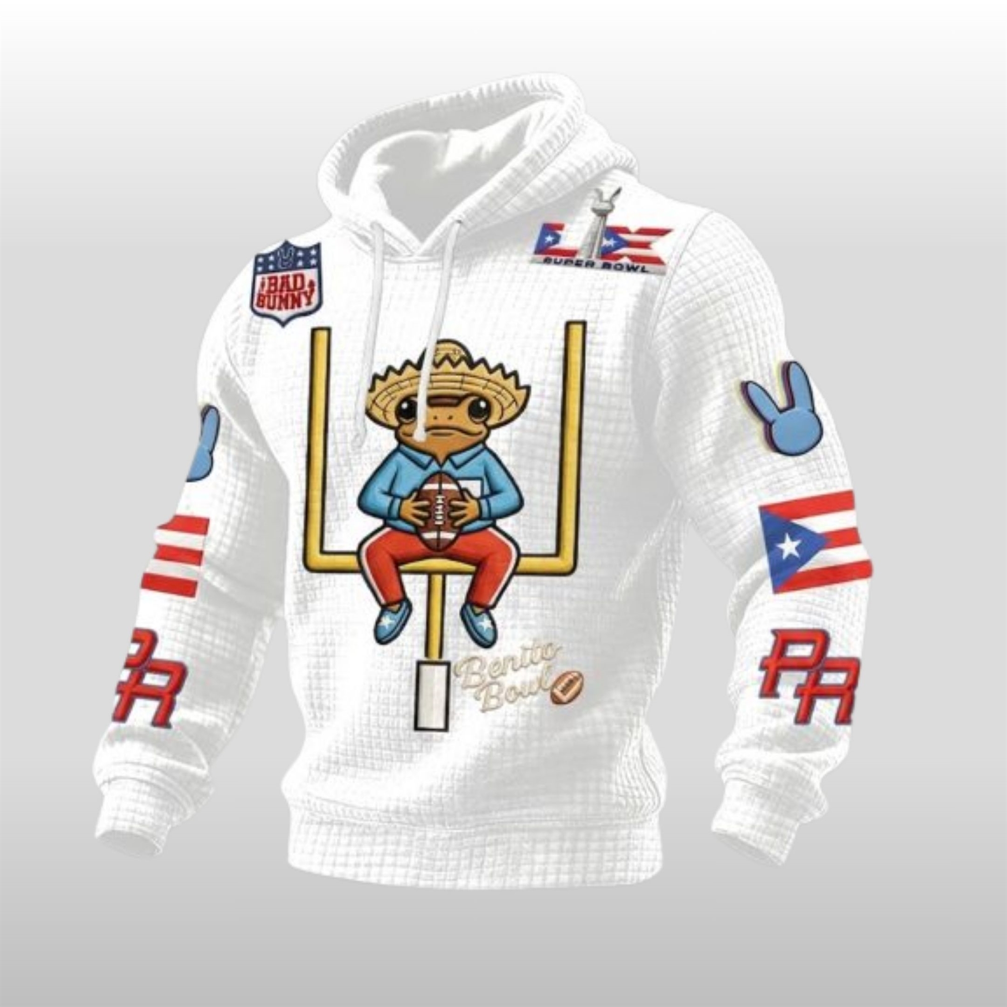 Furthermore, the “Benito Bowl” has become a massive cultural moment, driving an insatiable demand for gear that represents this specific era of Puerto Rican excellence. When top reggaeton artists and Caribbean influencers began sharing their unboxing videos, the Bad Bunny Benito Bowl Puerto Rico Waffle Hoodie became an overnight sensation. It represents a bold intersection of tropical tradition and modern streetwear hype, making it the must-have item for the 2026 season.