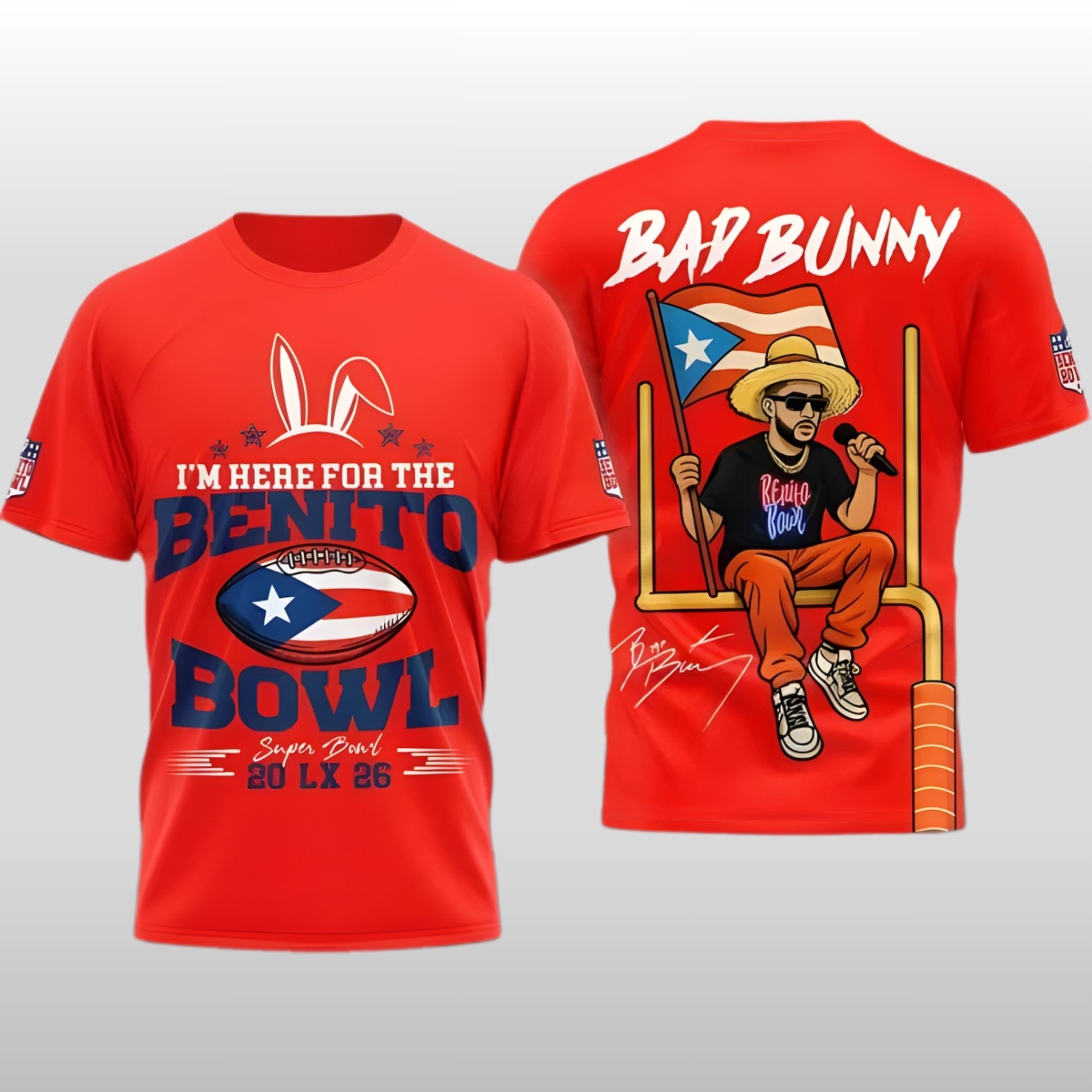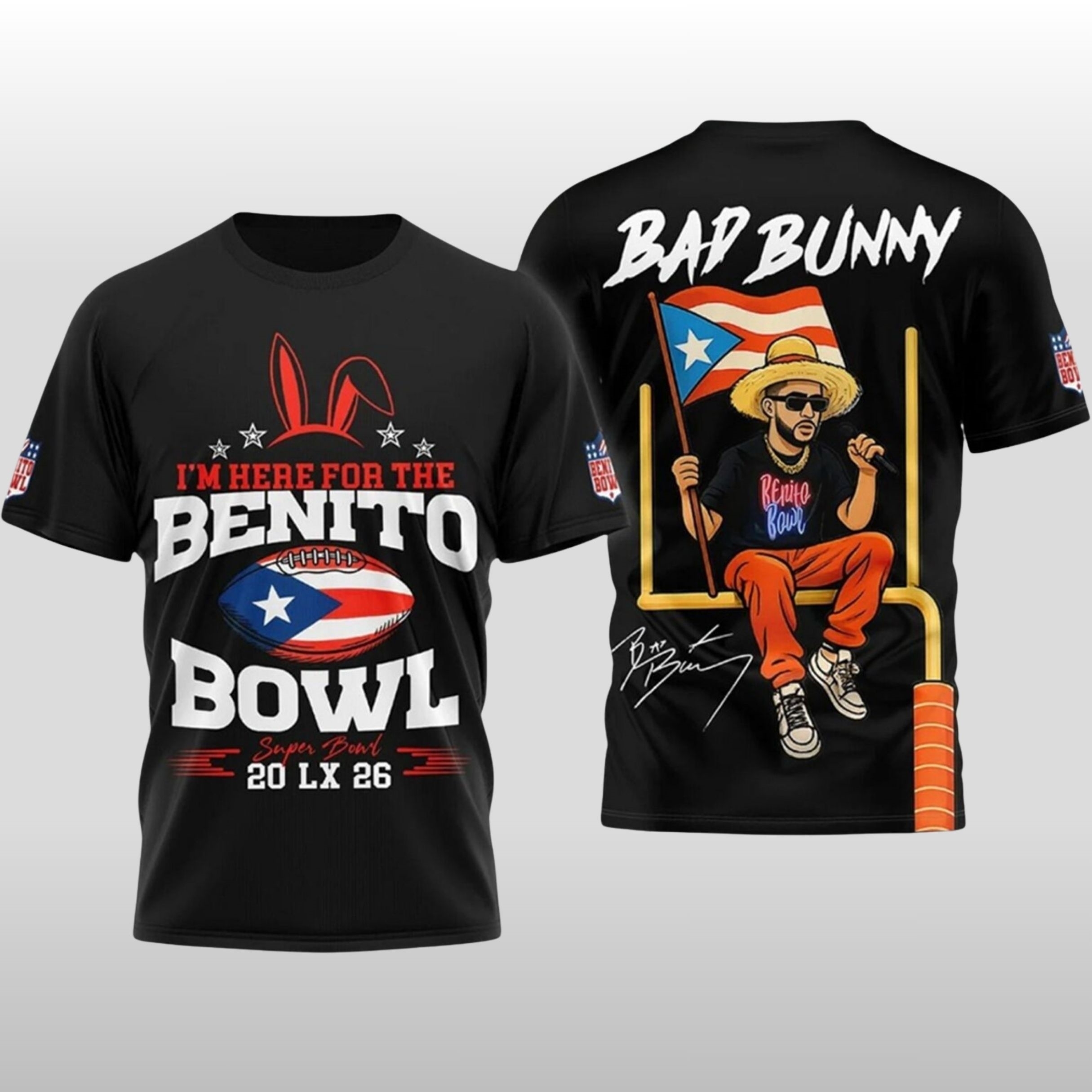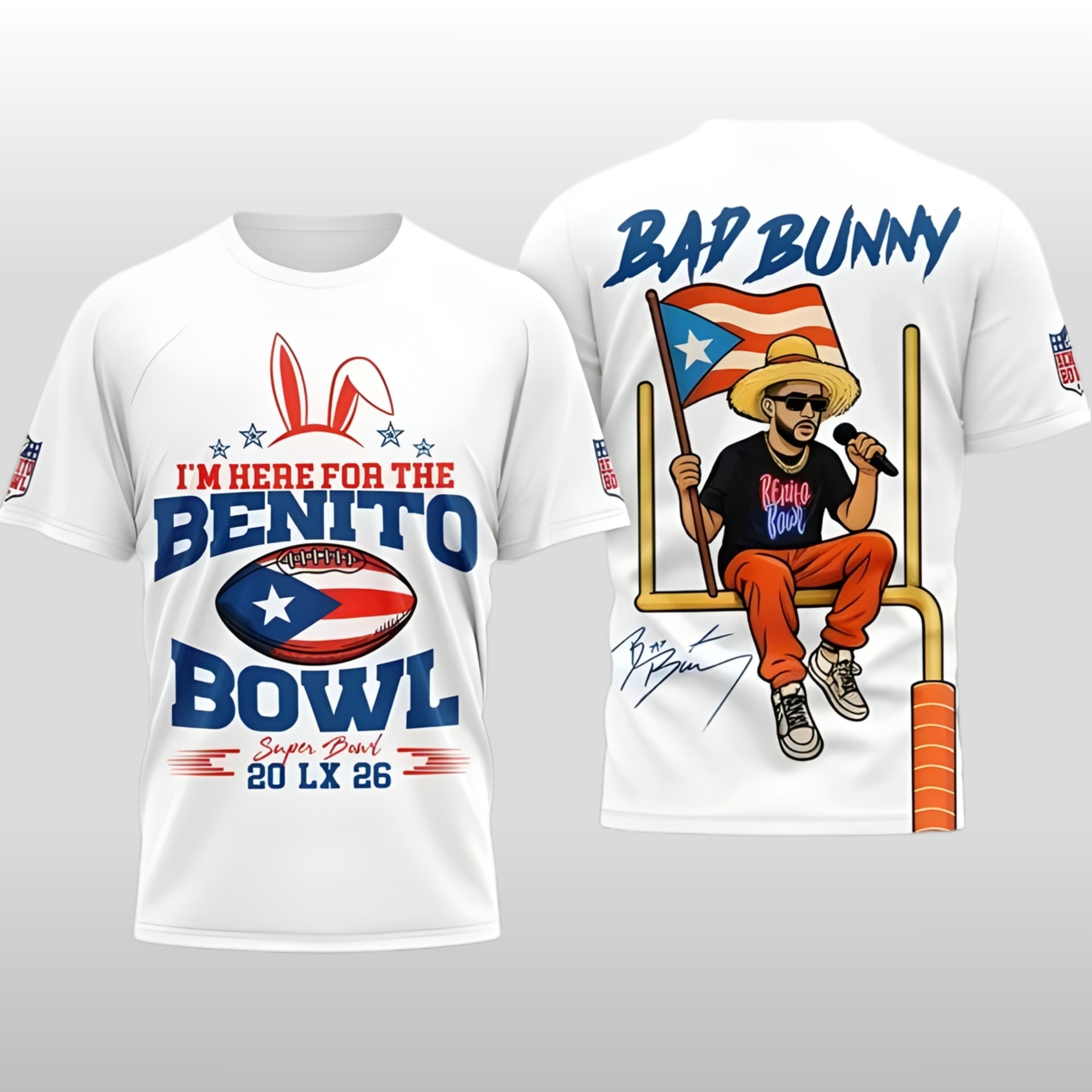 As the world descends upon the stadium in 2026, stand out in a design that captures the “Benito Bowl” phenomenon. This limited-edition shirt features a striking cartoon of Bad Bunny—complete with his signature sunglasses, bucket hat, and the Puerto Rican flag—perched atop a goalpost. With “20 LX 26” branding and the iconic bunny ears, it bridges the gap between sports history and musical revolution.