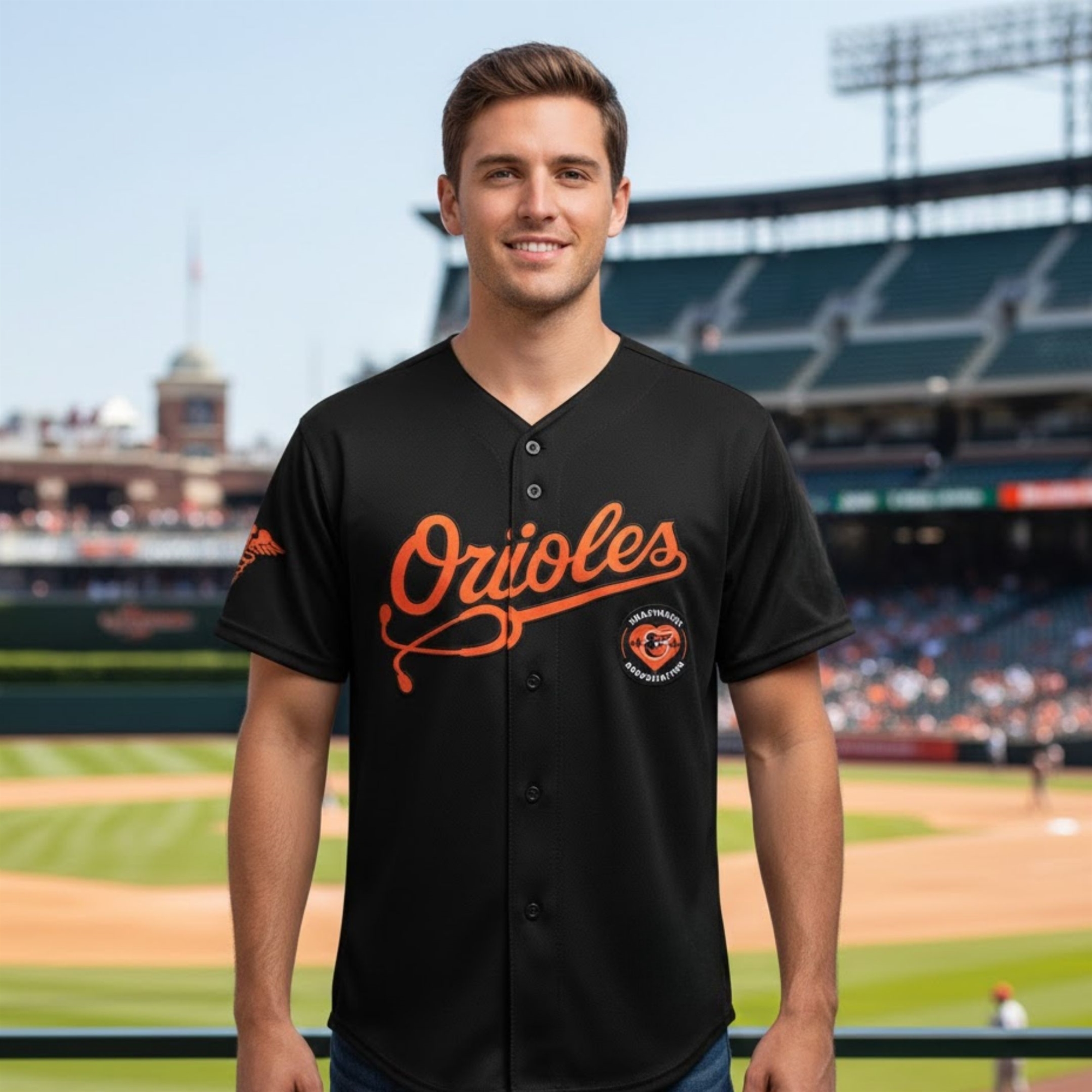 This jersey offers a sleek, modern twist on the classic Baltimore aesthetic. Ditching the standard white base for a bold “Midnight Onyx” finish, the design allows the vibrant orange accents to truly shine. The front features the iconic “Orioles” script, creatively integrated with a flowing stethoscope graphic that underscores the evening’s mission.
