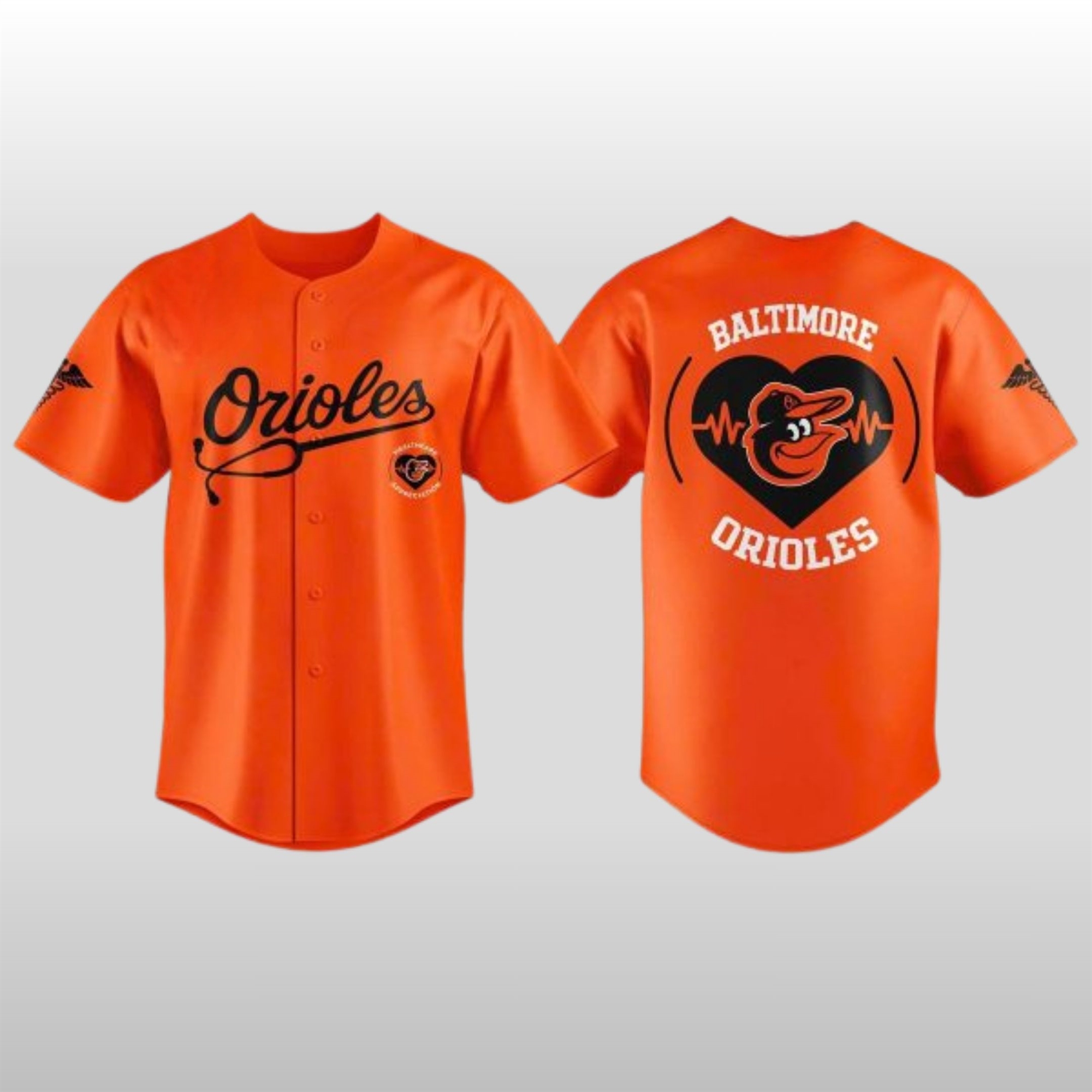 On the back, a striking “Heartbeat of Baltimore” motif takes center stage. A large orange heart contains the beloved bird logo, framed by a rhythmic EKG pulse line. This visual narrative perfectly captures the spirit of the city’s healthcare workers—the literal pulse that keeps the community thriving. It is more than just apparel; it is a wearable salute to those who serve on the front lines.