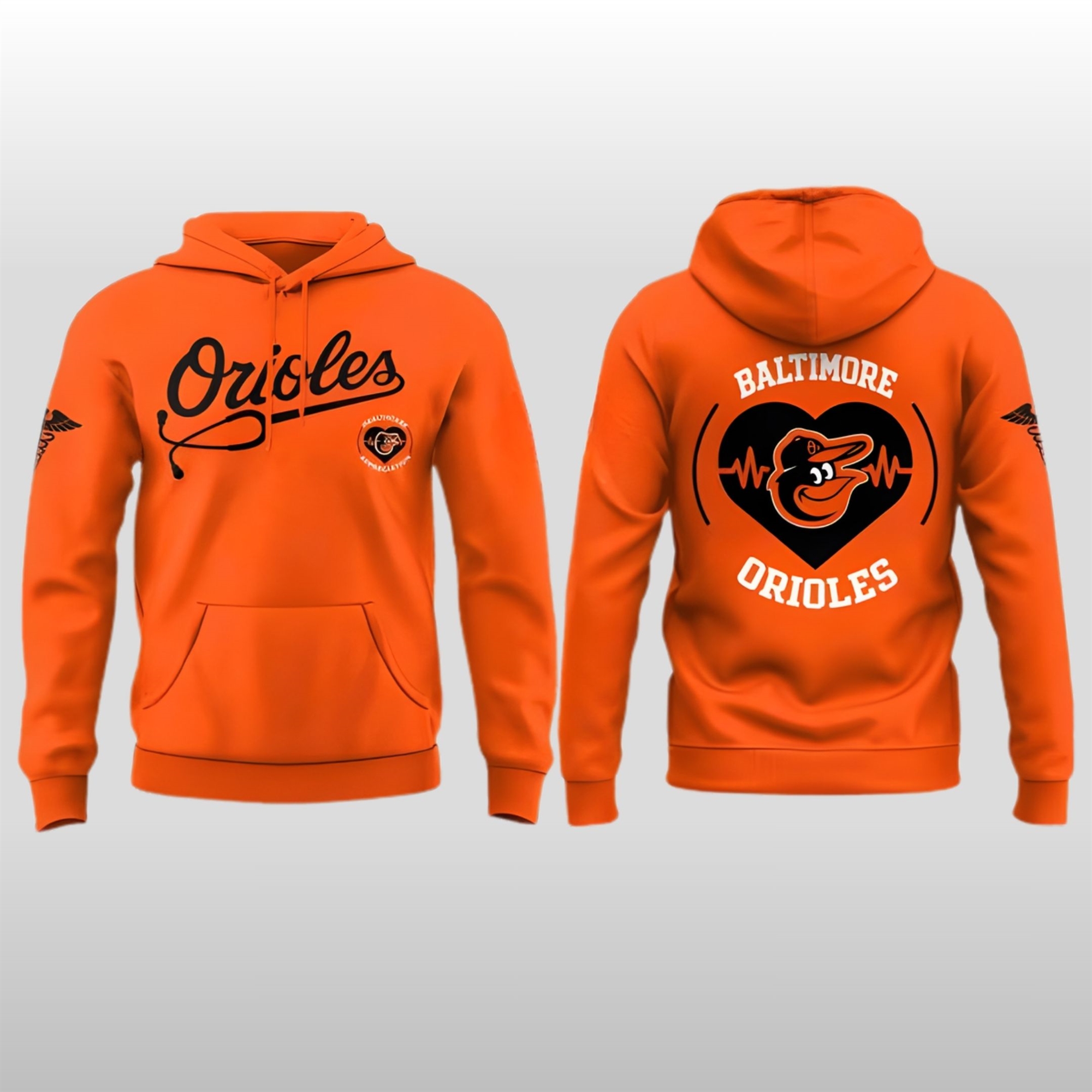 This hoodie is a masterclass in thoughtful design. Moving away from standard team layouts, it features a sleek “Blackout” base that makes the vibrant Baltimore orange truly radiate. The front showcases the classic “Orioles” script reimagined with a subtle stethoscope motif flowing from the lettering—a clever nod to the healthcare profession.