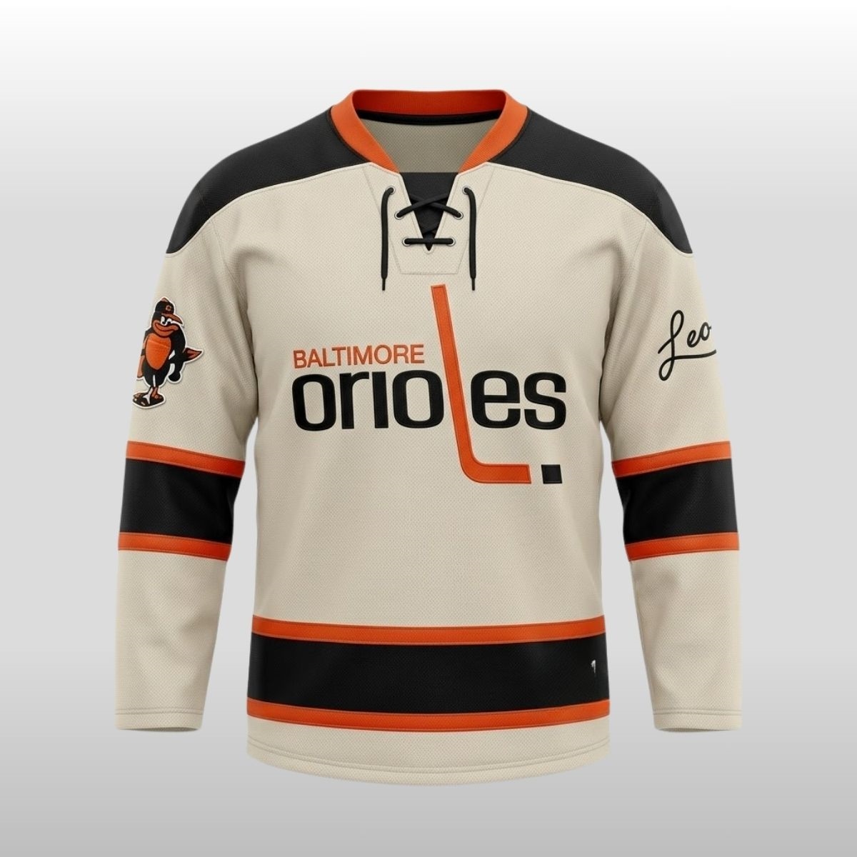 The intersection of diamond heritage and rink-ready style arrives in 2026, offering fans a unique crossover piece that blends two of the city’s favorite sporting aesthetics. This special event piece celebrates the grit and history of local sports culture through a heavy-duty, winter-ready design. Released during a high-stakes weekend series to honor the transition from the chill of spring to the heat of the summer race, the jersey features bold “Baltimore Orioles” typography across the chest, accented by a stylized hockey stick that cleverly forms the “L” in the name. The cream-colored base is grounded by heavy black and orange stripes on the sleeves and waist, while the classic cartoon bird mascot sits proudly on the shoulder, donning a tiny helmet to match the theme.