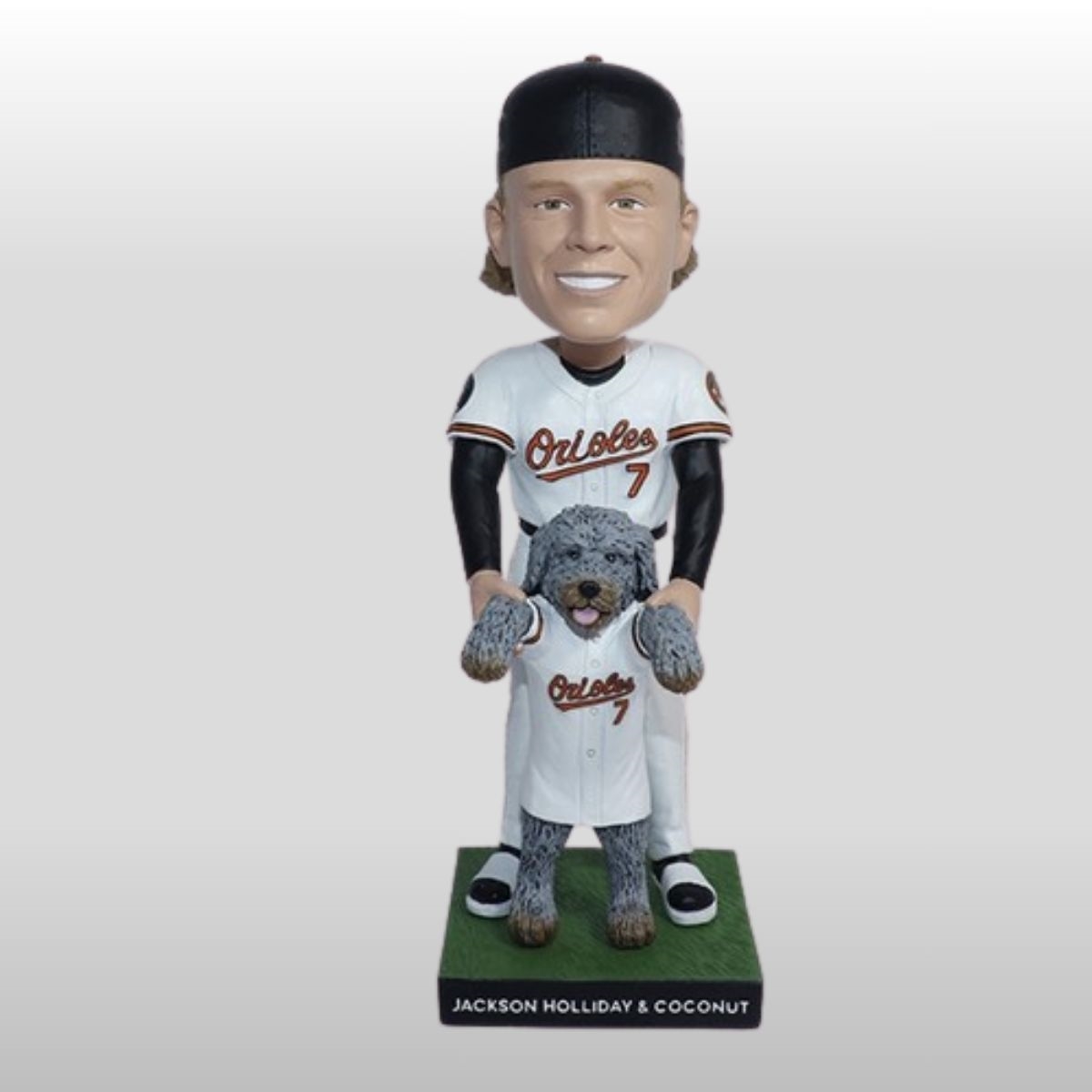 What makes this item truly special is the story it tells about life off the field. In a world of high-stakes competition, the sight of a young phenom and his dog reminds everyone of the simple joys that ground us. The base of the figurine is elegantly inscribed with “Jackson Holliday & Coconut,” anchoring the piece with a professional touch. This giveaway isn’t just about a game; it’s about the community coming together to celebrate a new era of talent and the furry friends who support them along the way. Whether you are a long-time resident or a new fan, owning this Jackson Holliday and Coconut Baltimore 2026 Giveaway Bobblehead is the best way to show your local pride.