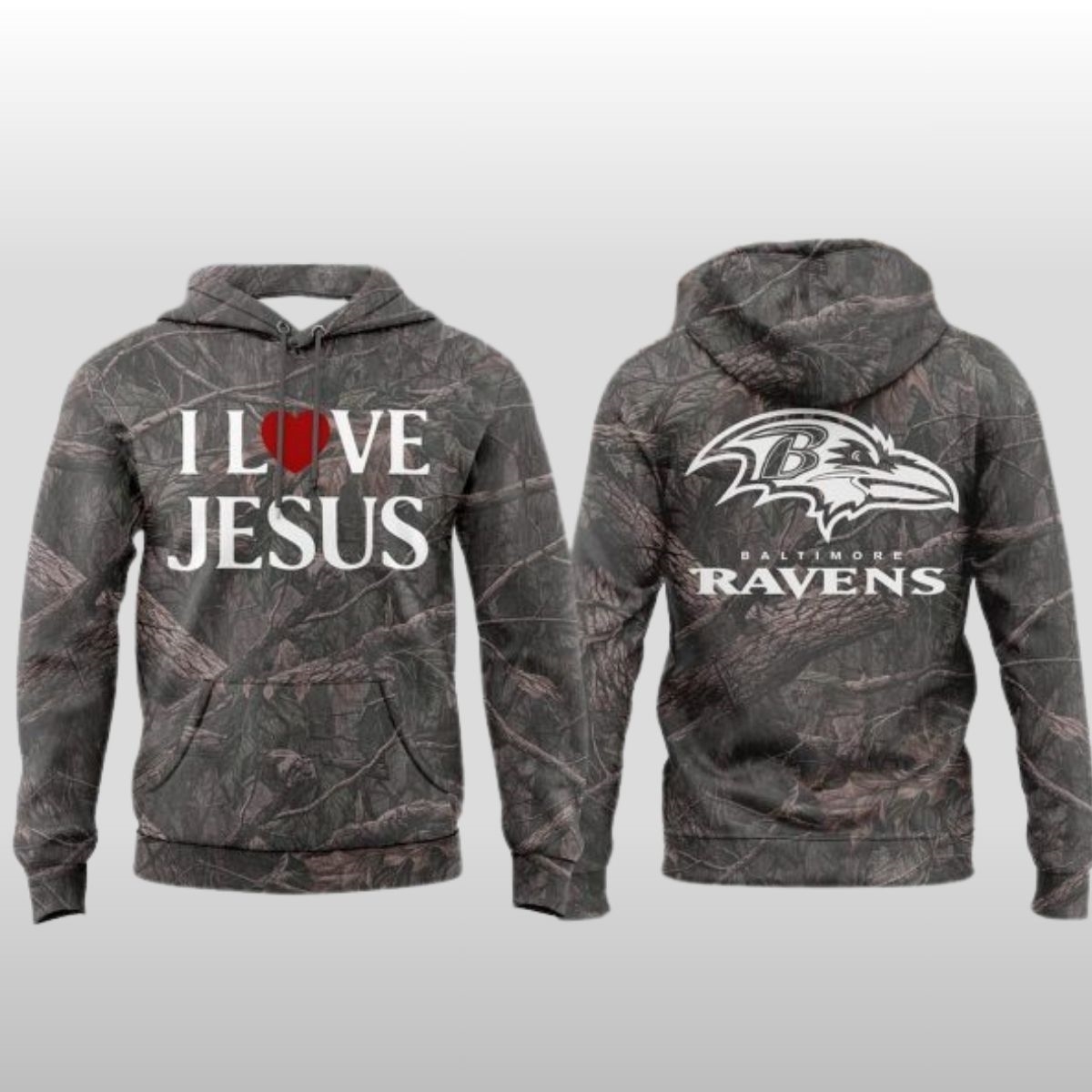 2026 Baltimore Ravens I Love Jesus Forest Camo Hoodie – Faith and Passion Combined