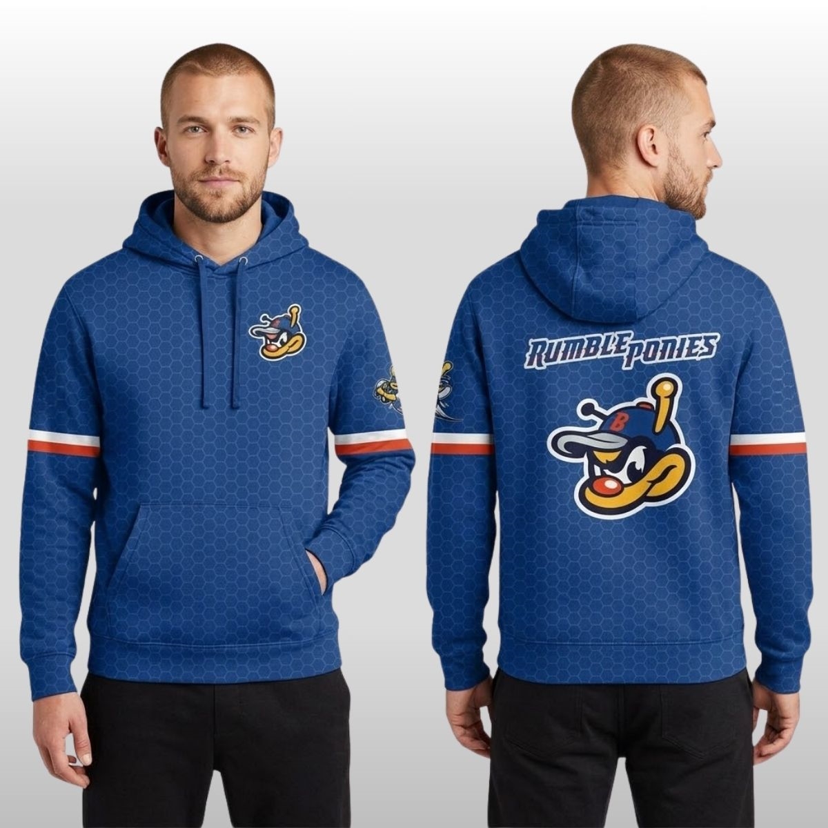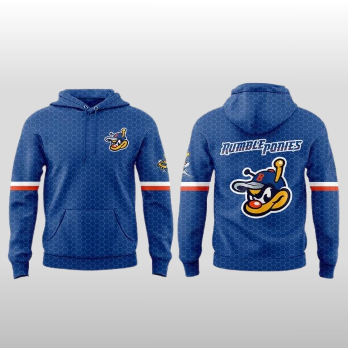 Experience a unique fusion of local sports history and modern comfort with the 2026 Binghamton Rumble Ponies x BMets Night Hoodie. This exclusive release celebrates the enduring spirit of baseball in the Southern Tier, paying tribute to the team’s evolution while keeping fans warm during those breezy evening games. The design features a striking royal blue base covered in a subtle, repeating hexagonal pattern that adds a technical, modern edge to the classic pullover silhouette. Across the back, the “Rumble Ponies” script is emblazoned in a bold, athletic font, anchored by a large, high-definition graphic of the team’s fierce mascot wearing a signature cap. A standout detail is the vibrant orange and white horizontal stripes circling the sleeves, providing a pop of color that honors the traditional palette of the Binghamton baseball community.