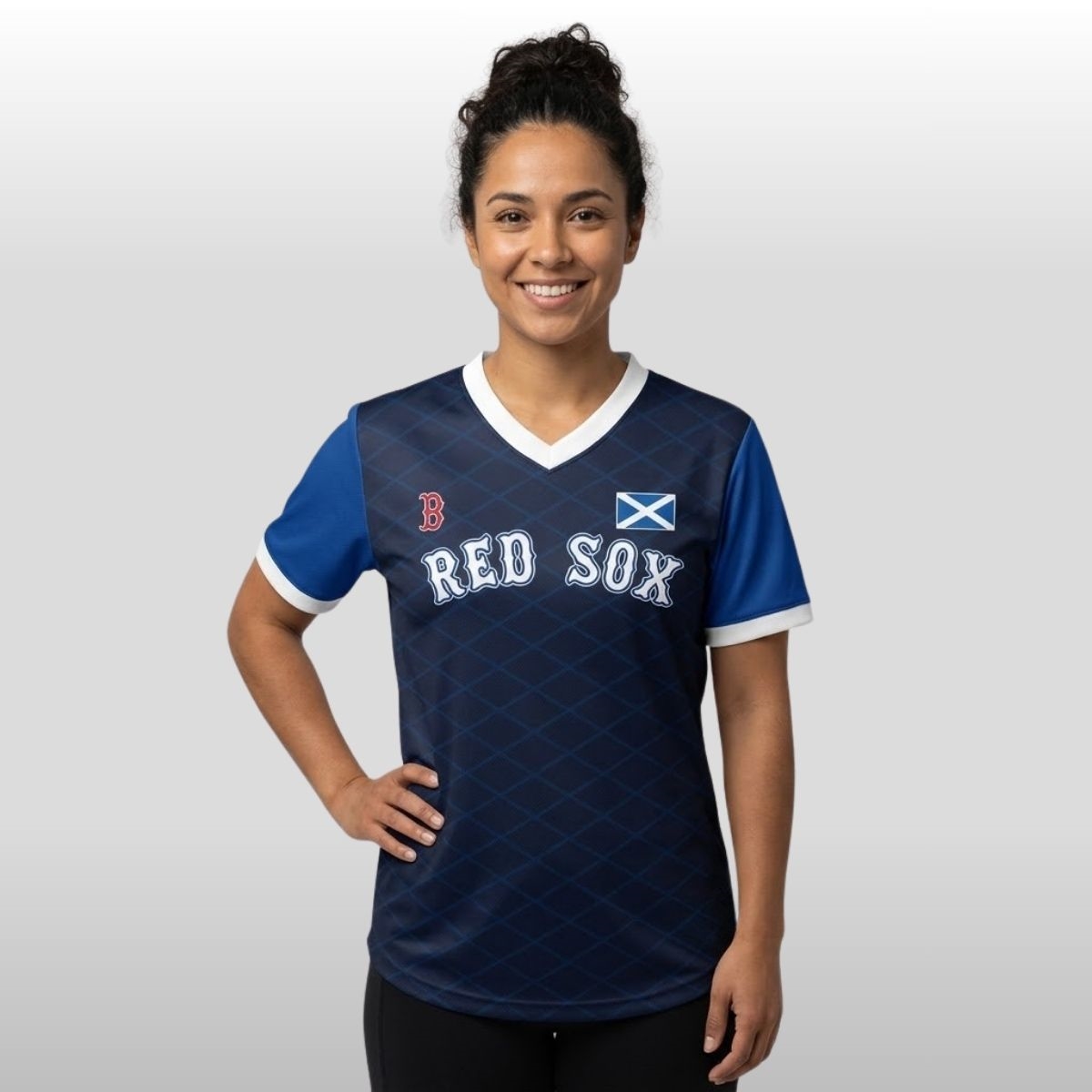 The Boston Red Sox 2026 Scottish Heritage Jersey Giveaway is a stunning fusion of New England baseball tradition and deep-rooted Celtic pride. Designed to celebrate the historical ties between Boston and Scotland, this special edition garment swaps out the traditional pinstripes for a sophisticated navy blue base adorned with a subtle, tonal diamond lattice pattern reminiscent of classic Scottish textiles. The jersey features the iconic “Red Sox” wordmark across the chest in a stylized font, flanked by the Saltire—the national flag of Scotland—on the left chest and the classic “B” logo on the right. With its vibrant royal blue sleeves and clean white V-neck trim, this piece serves as a bridge between the Emerald Necklace of Boston and the rugged Highlands.