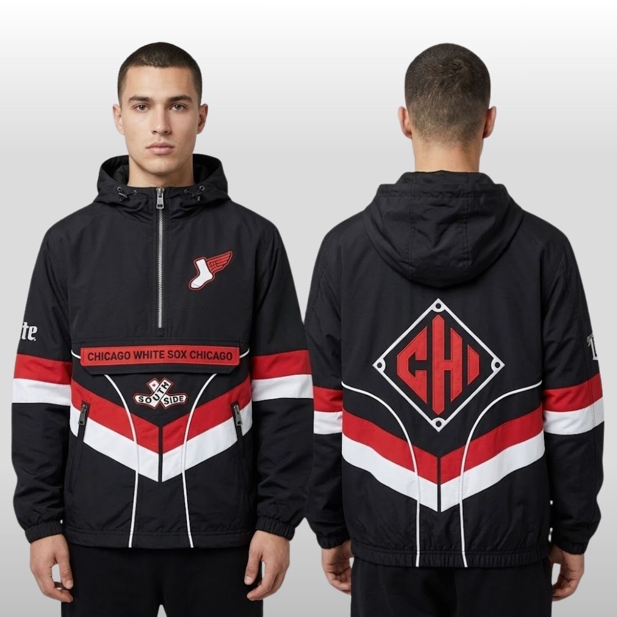 The 2026 Chicago White Sox ’90s City Connect Jacket Giveaway celebrates a fusion of South Side grit and vintage aesthetics. This heavy-duty windbreaker features a bold black base accented by sharp red and white chevron piping across the midsection and sleeves. The front showcases a unique “winged sock” emblem on the chest, a classic “South Side” cross-logo on the lower pocket flap, and a prominent red banner reading “CHICAGO WHITE SOX CHICAGO” stretching across the torso. On the reverse, a large diamond-shaped CHI monogram takes center stage, framed by white structural piping that mimics the architecture of a ballhouse. This exclusive piece captures the high-energy spirit of the 1990s, offering fans a wearable piece of history during one of the most anticipated stadium events of the year.