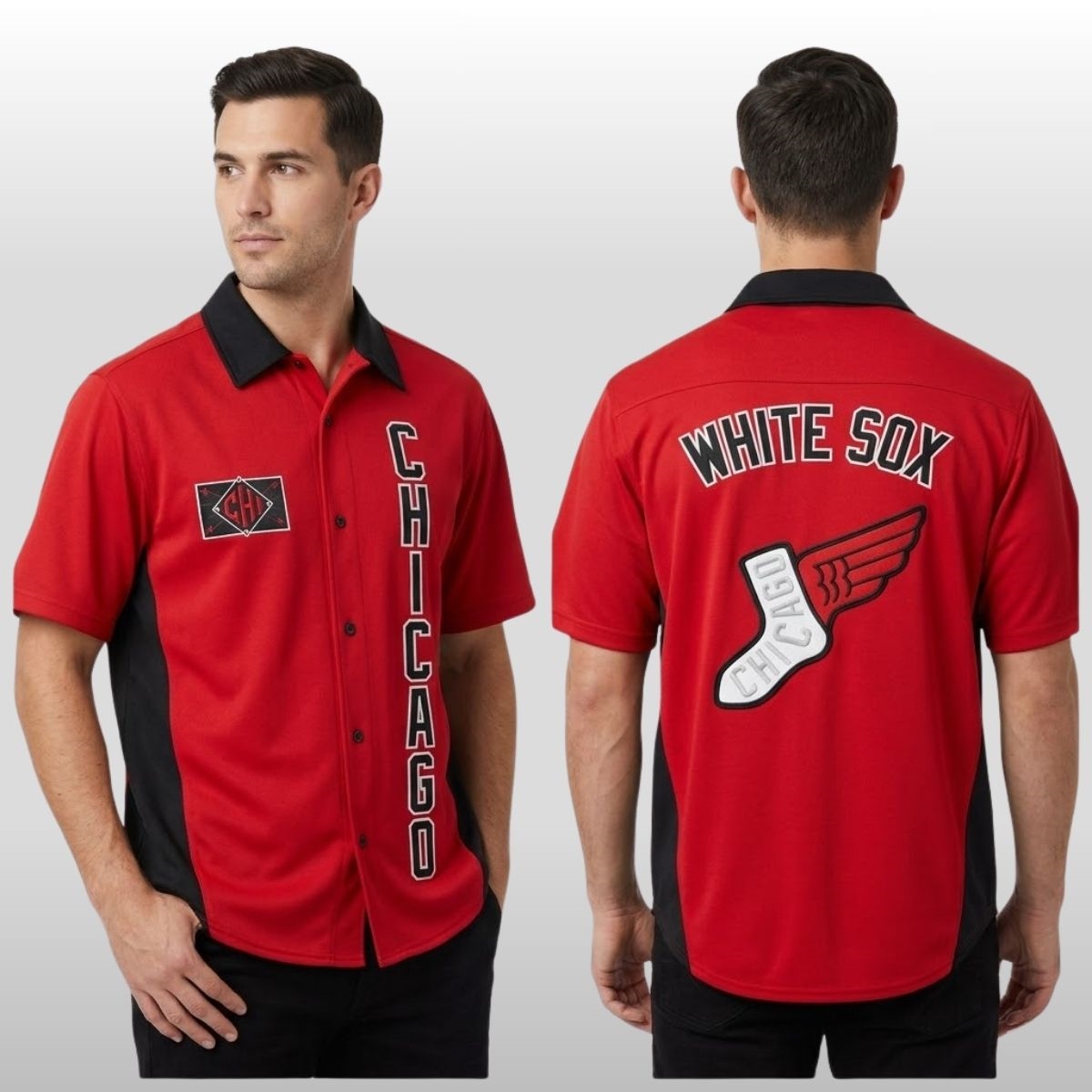 This standout shirt features a bold crimson base complemented by sleek black side panels and a refined button-down collar. The back showcases the iconic winged “Chicago” sock logo, while the front displays a vertical “CHICAGO” wordmark and a geometric chest patch. It is the ultimate choice for supporters who want to maintain a sharp, spirited look during the warmer months while celebrating the deep roots of the South Side.