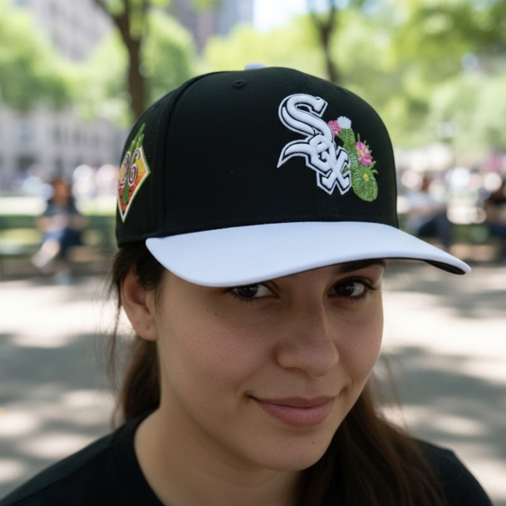 This hat is a masterclass in seasonal storytelling. It breaks away from the stark black-and-white tradition to embrace a vibrant “Cactus Green” and “Sunset Orange” palette. The front of the crown features the iconic Old English “Sox” logo, reimagined with an intricate blooming cactus embroidery that wraps around the lettering. This design choice pays homage to the team’s roots in the Cactus League while establishing a bold, modern aesthetic.