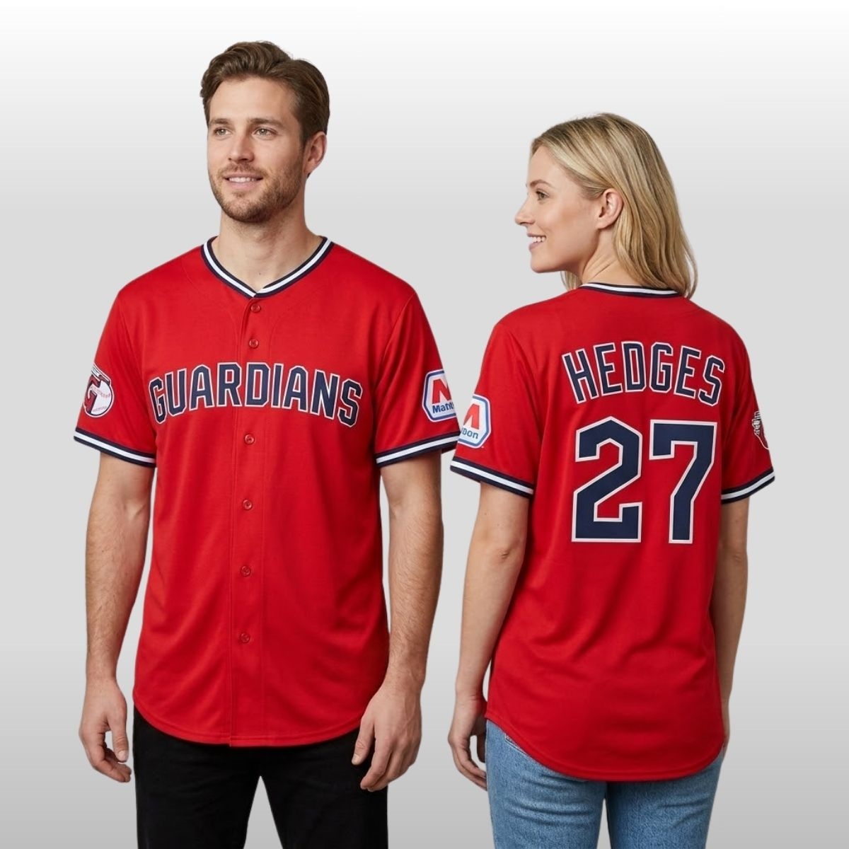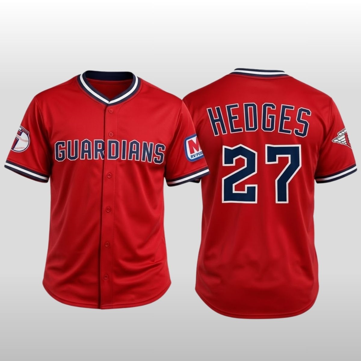 The design of this apparel is a meticulous study in modern sports aesthetics combined with traditional flair. On the back, the name “HEDGES” is arched across the shoulders in a bold navy serif font, paired with his signature number 27. The white bordering on the numbers ensures high visibility, mirroring the high-energy presence the catcher maintains behind the plate. Detailed patches adorn the sleeves, including the team’s winged “G” logo and a commemorative sponsor patch, adding layers of texture and storytelling to the garment. The use of breathable, lightweight fabric makes it an ideal choice for those humid summer afternoons when the tension on the field is as hot as the weather outside.