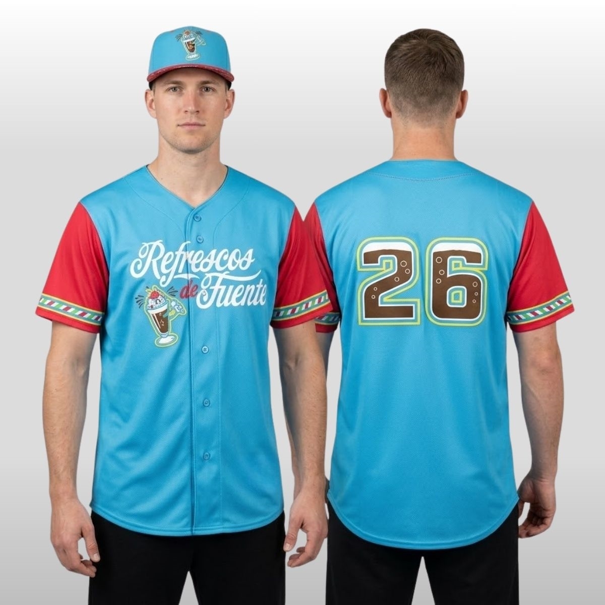 Step back into the golden age of the neighborhood drugstore with the 2026 Columbus Clingstones Fountain Soda Refrescos de Fuente Jersey. This year’s standout giveaway captures the effervescent charm of a vintage soda fountain, blending a refreshing sky-blue palette with bold, retro accents. Rather than a traditional sports look, this jersey celebrates the “Refrescos de Fuente” theme, featuring elegant cursive script across the chest that feels like a hand-painted sign from a 1950s diner. The vibrant red sleeves and candy-striped trim on the cuffs provide a pop of color that mirrors the classic aesthetic of an old-school malt shop.