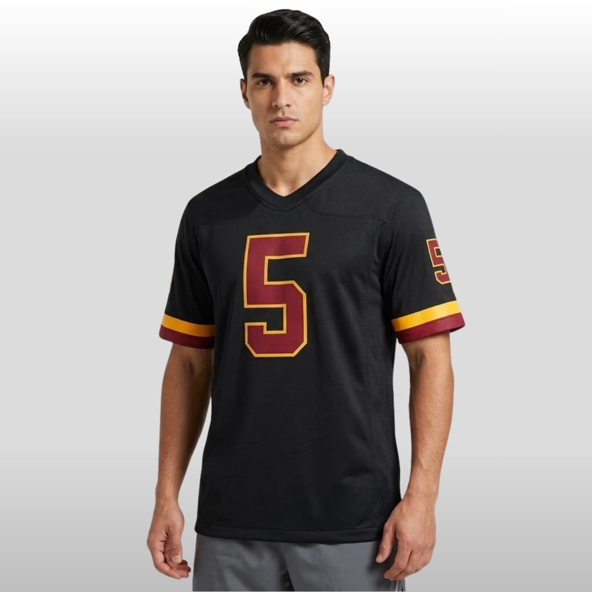 Step into the next era of fan culture with a garment that defines intensity and local pride. The 2026 Commanders Hail Raiser Uniform Jersey arrives as a centerpiece for the upcoming “Rally at the River” fan festival, an event dedicated to the most vocal supporters who bring the thunder to every home game. This piece isn’t just about showing up; it’s about the energy of the crowd. The jersey features the name “DANIELS” arched across the back in a bold, athletic gold font, while the number “5” is prominently displayed on the front, back, and shoulders. The numbering uses a striking deep burgundy core outlined in vibrant gold, creating a three-dimensional effect that mirrors the high-stakes atmosphere of a sold-out stadium under the Friday night lights.