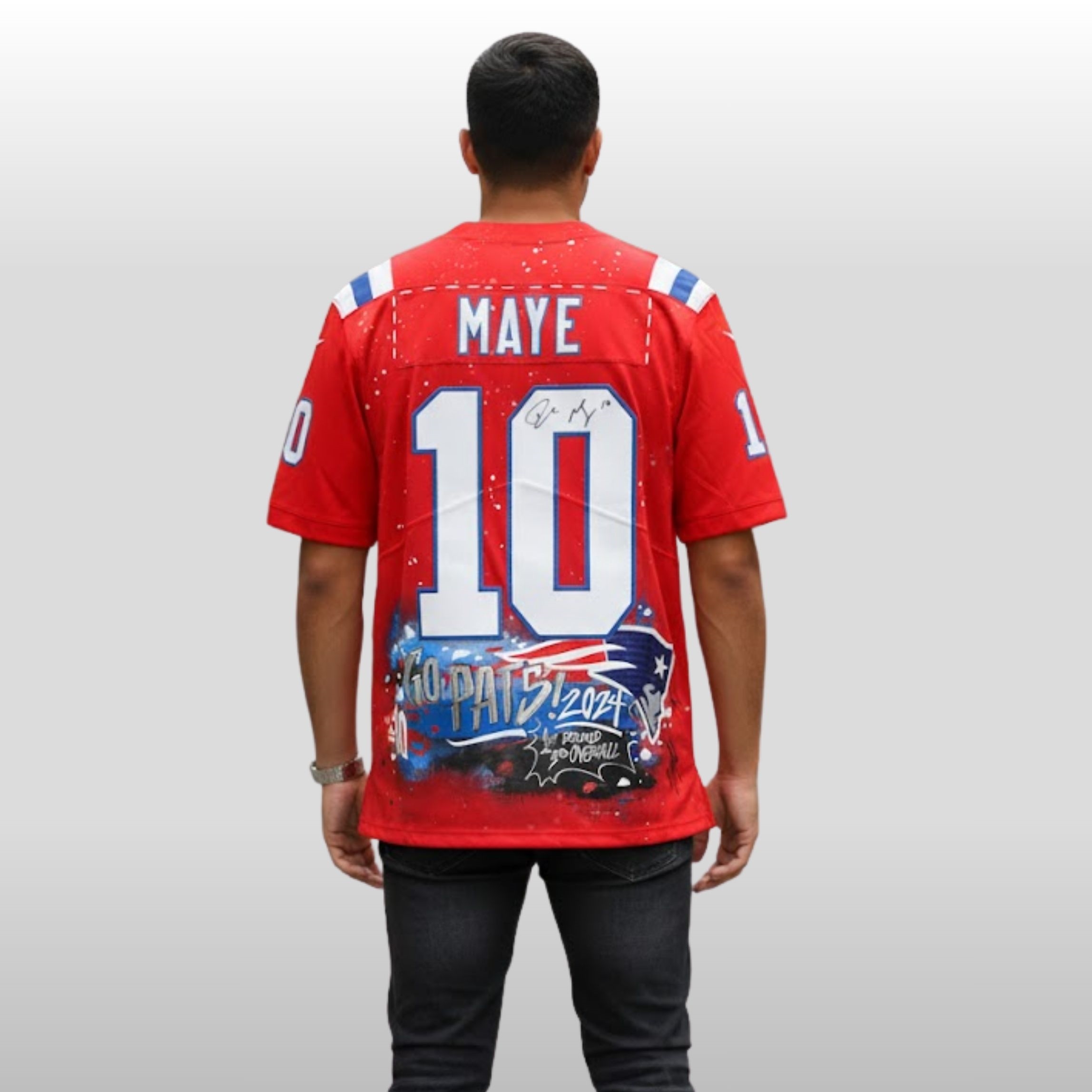 The jersey is a masterclass in custom aesthetics. It breathes new life into the classic red “Pat Patriot” era palette, layering it with a “Street Art” finish that features white paint splatters and aggressive, hand-painted details. The back features “MAYE” across the nameplate in sharp, blocked lettering, anchored by the iconic number 10.