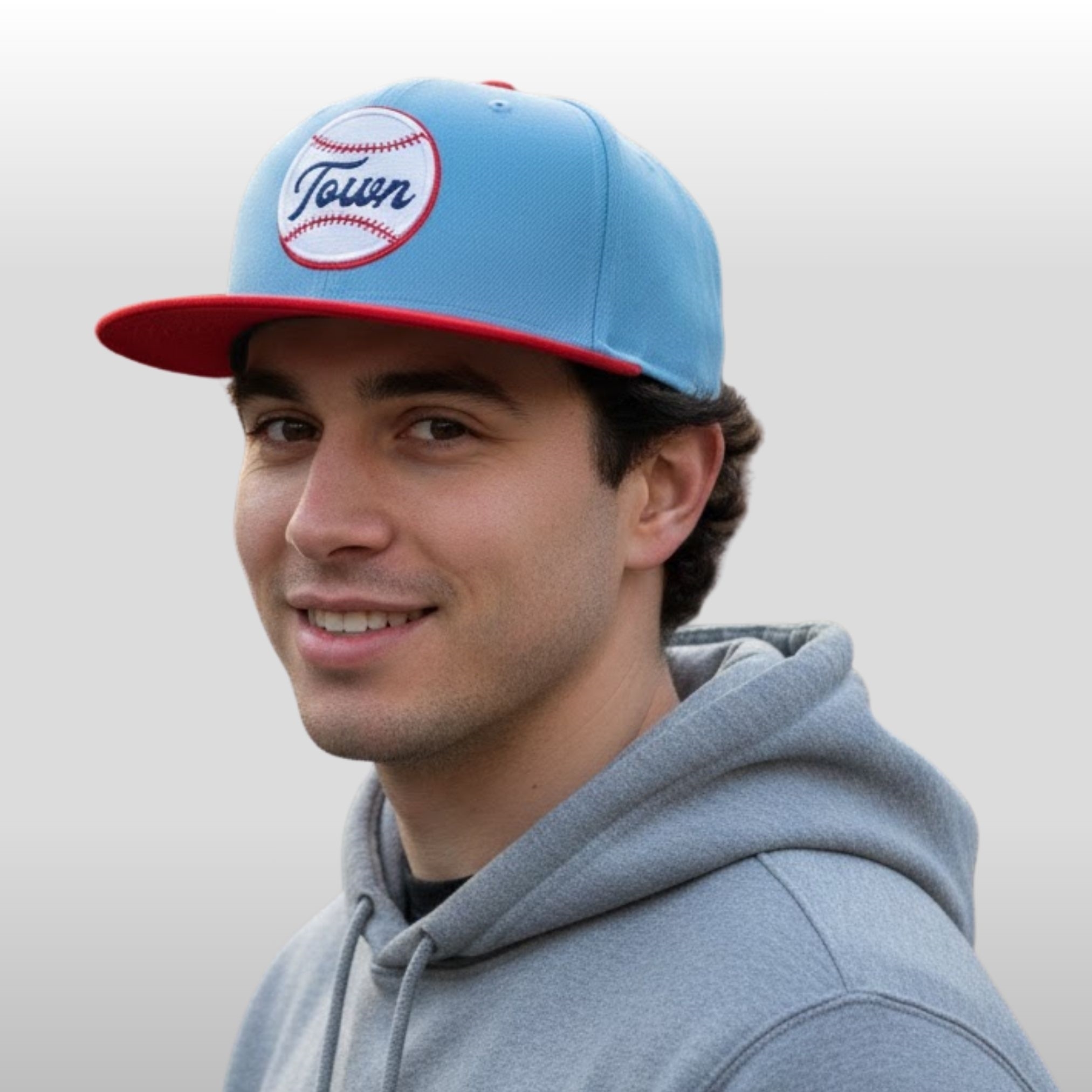 The centerpiece is a meticulously embroidered circular patch. It showcases a vintage-white baseball background, complete with realistic red stitching, framing the word “Town” in a sophisticated navy-blue script. The structured crown and flat-bill design offer a contemporary silhouette, ensuring you look sharp whether you’re behind home plate or out on the streets. This Fightin Phils design has gone viral across social media because it perfectly taps into the “retro-cool” trend, blending 80s-inspired color palettes with the clean lines of modern streetwear.