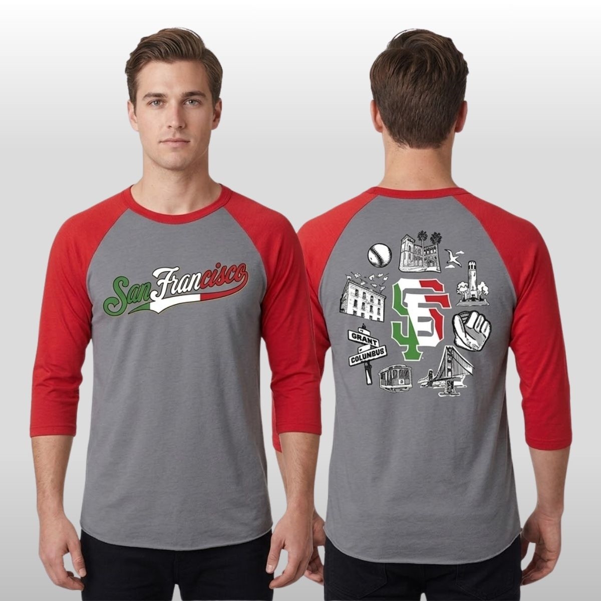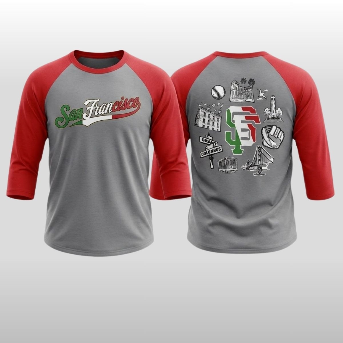 Celebrate the intersection of culture and sports with a garment that honors the deep-rooted connections between San Francisco and its vibrant Italian community. This 3/4-sleeve raglan shirt features a grey heather body paired with bold red sleeves, creating a classic athletic aesthetic. On the front, “San Francisco” is written in an elegant, flowing script stylized with the green, white, and red of the Italian flag. The back is a visual tribute to North Beach and beyond, showcasing a central “SF” logo surrounded by intricate illustrations of a cable car, the Golden Gate Bridge, Coit Tower, and the iconic street signs of Grant and Columbus. This shirt is a centerpiece for the 2026 celebration of heritage, craftsmanship, and local pride.