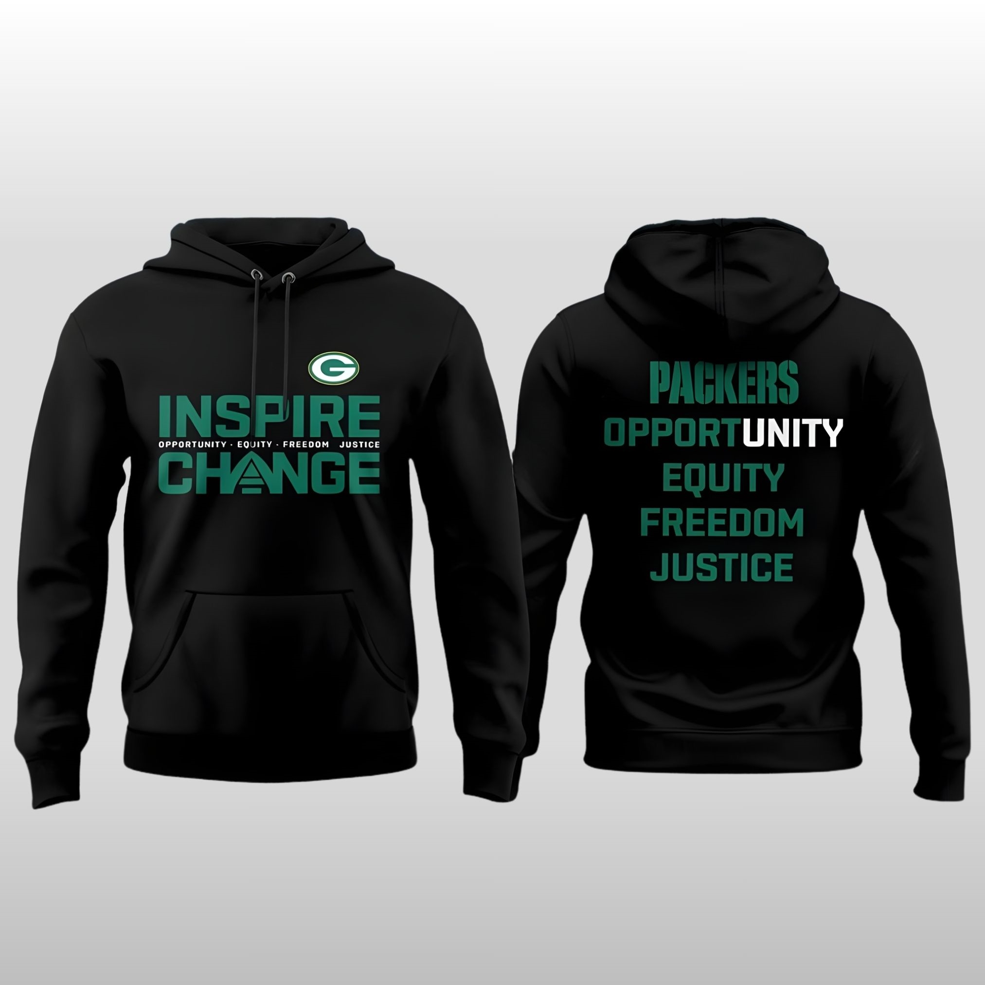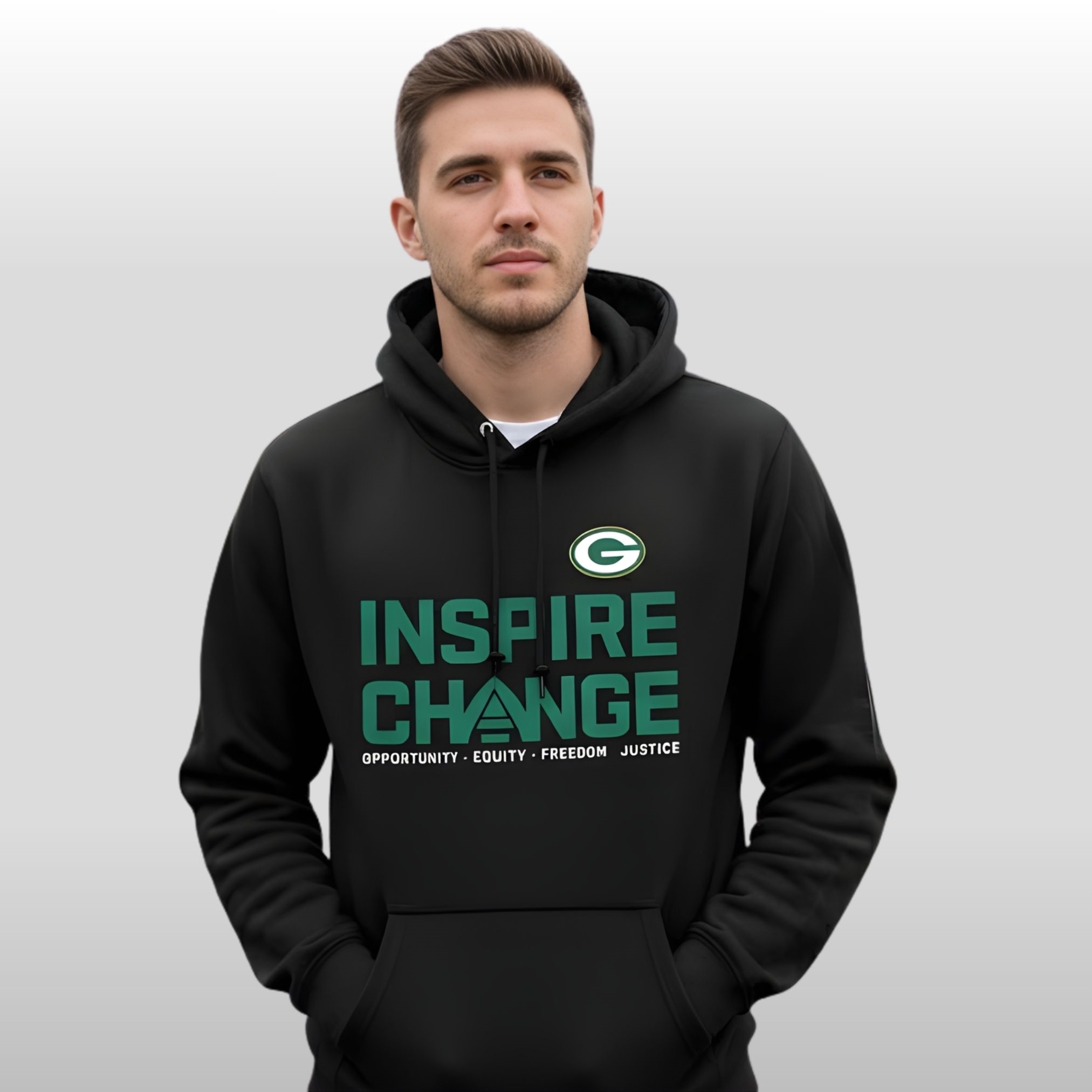 The 2026 Green Bay Packers Inspire Change Hoodie is a masterclass in meaningful design. This premium black hoodie features a striking forest green “G” logo on the chest, anchored by the powerful “INSPIRE CHANGE” graphic in a bold, modern typeface. Beneath the main text, the core pillars—Opportunity, Equity, Freedom, and Justice—are cleanly printed to remind everyone what the movement stands for.