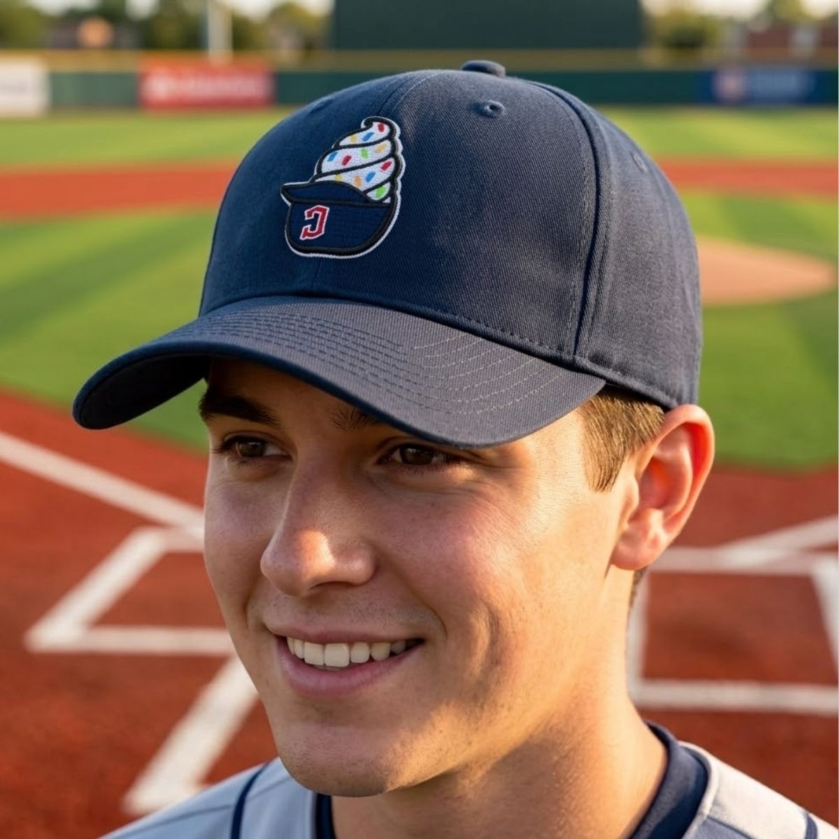 The design of this piece is a masterclass in playful storytelling. Crafted in a deep navy blue that echoes the team’s primary colors, the crown serves as the perfect backdrop for the centerpiece: an embroidered logo of a soft-serve ice cream swirl sitting inside a miniature batting helmet. The “C” on the tiny helmet is rendered in a bold, traditional red, while the sprinkles on the white swirl pop with shades of sky blue and gold. It is a visual nod to the iconic “Bertman’s” style treats that have become a staple for generations of families attending games under the warm summer sun.