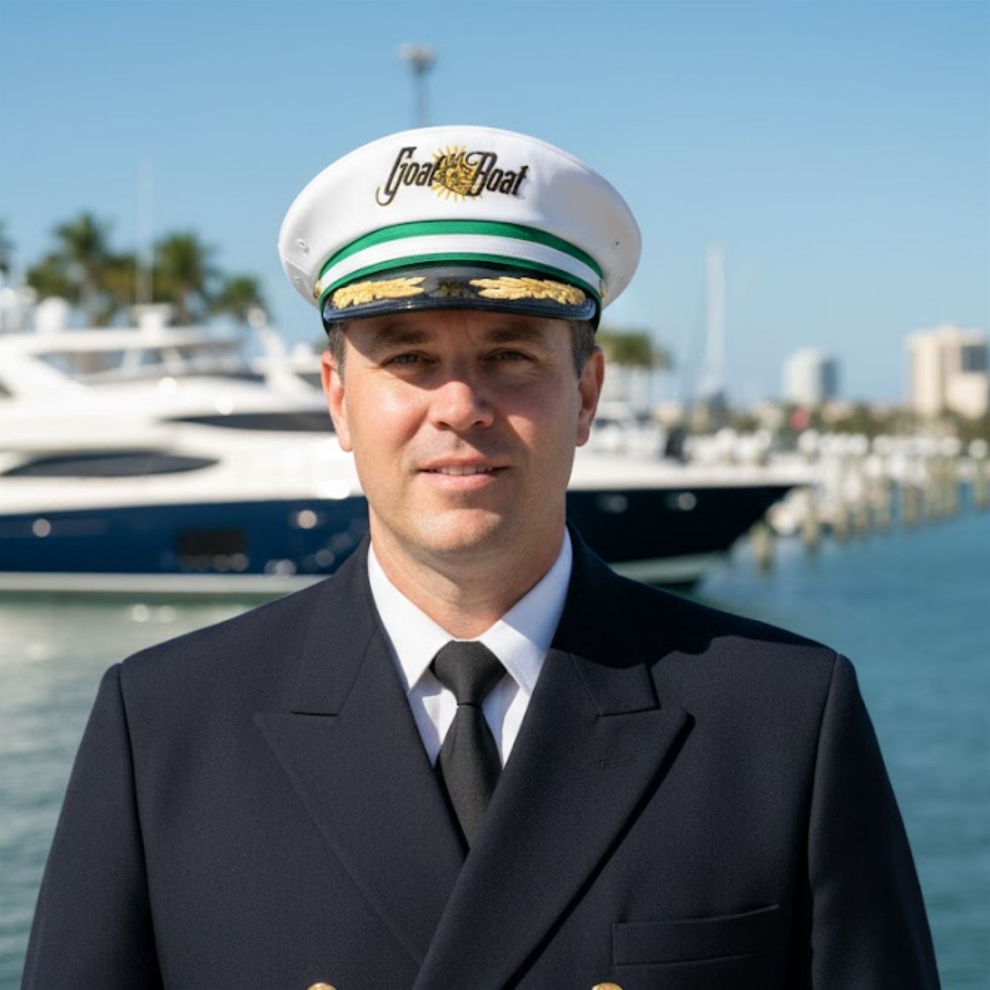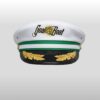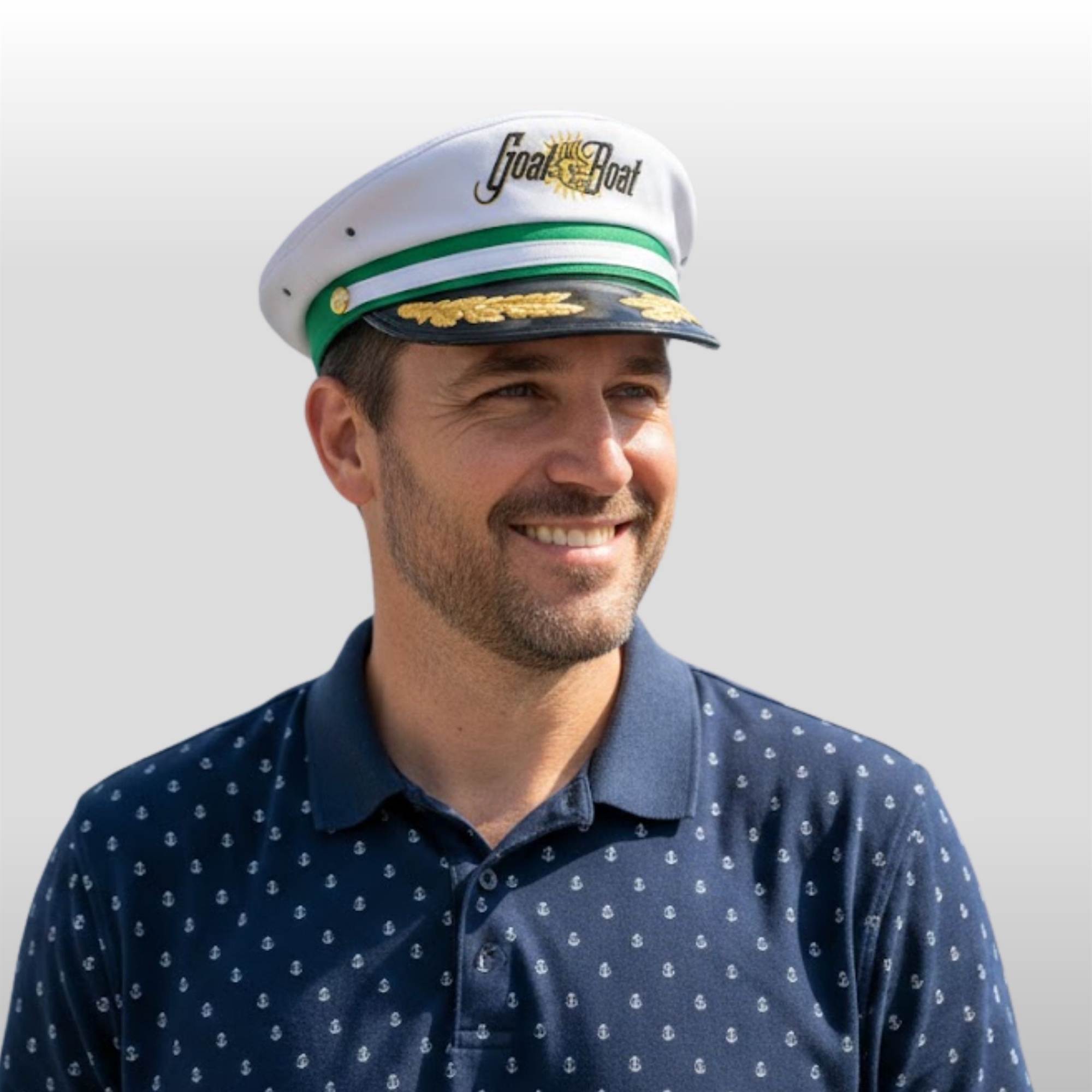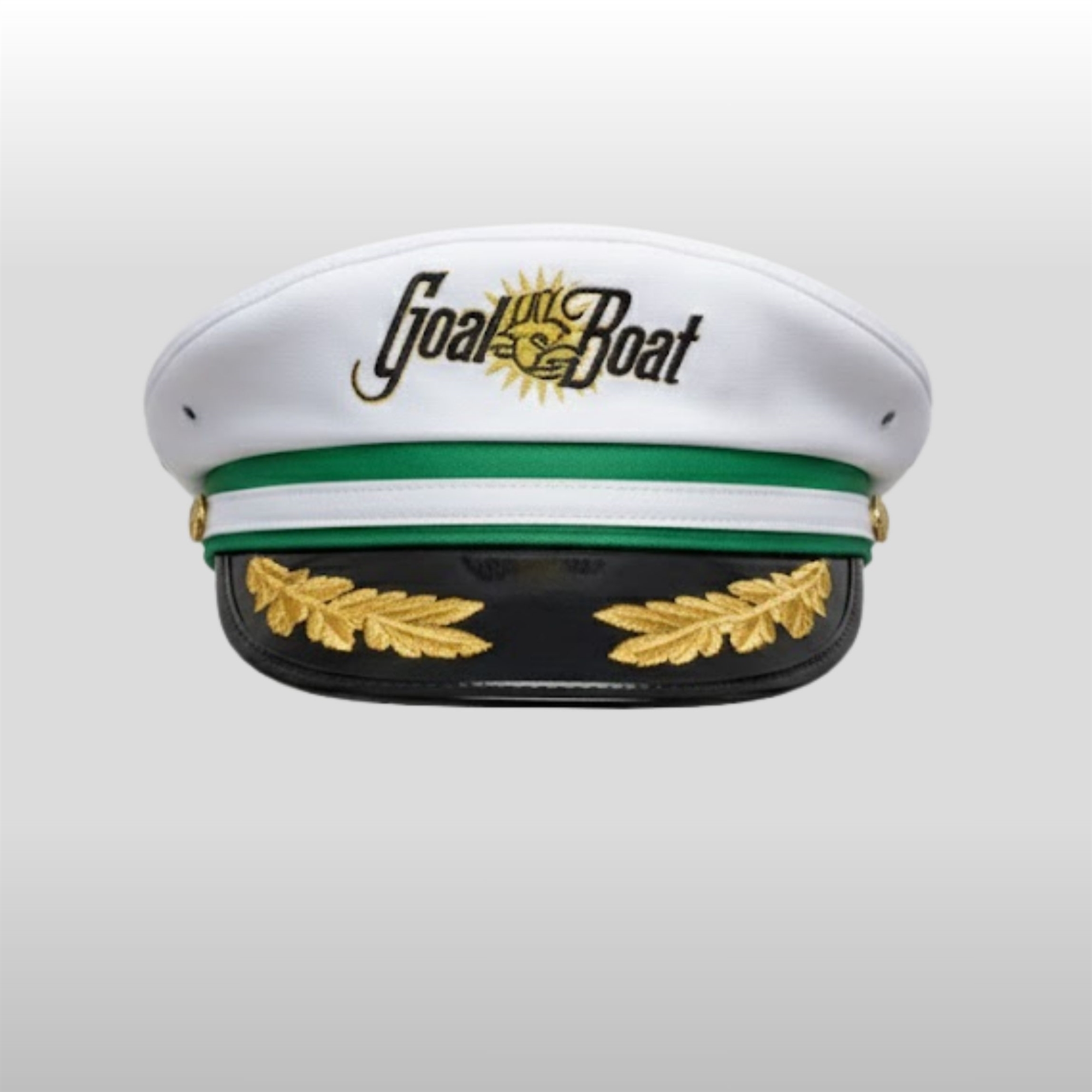This captain’s hat is a masterclass in themed design. It breaks away from standard baseball headwear to embrace a nautical aesthetic that perfectly complements the “Goal Boat” branding featured prominently on the crown. The hat features a crisp white top paired with a striking green and white striped band, creating a visual that pops against the summer sky. The front displays the “Goal Boat” script alongside a golden sun and goat emblem, blending the team’s playful identity with a classic naval silhouette.
