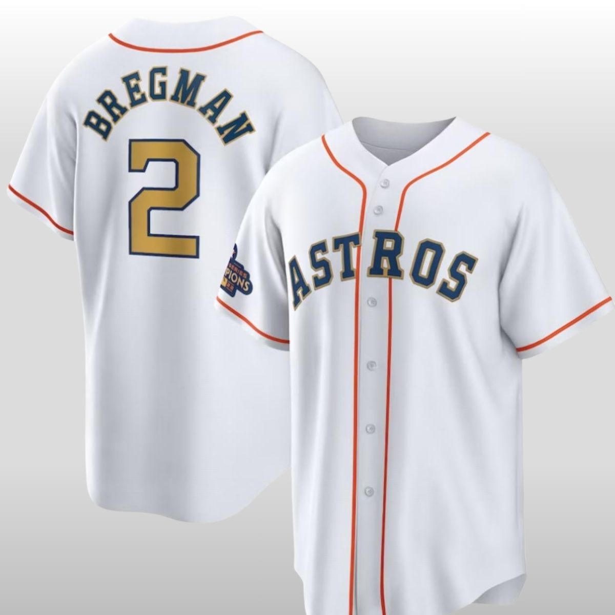 Get ready to elevate your fan wardrobe with a piece that truly shines. The 2026 Houston Astros Gold Rush Jersey Giveaway is more than just a piece of apparel; it is a celebration of a team that consistently aims for the highest standard in professional baseball. This specific jersey features a clean, crisp white base accented by vibrant orange piping that runs along the sleeves and neckline. The front displays the iconic “ASTROS” wordmark in navy blue with a sophisticated gold outline, while the back showcases Alex Bregman’s name and his signature number 2, rendered in a bold, shimmering metallic gold finish. On the right sleeve, a specialized commemorative patch marks the historic achievements of the franchise, making this a high-demand item for any serious collector or supporter.