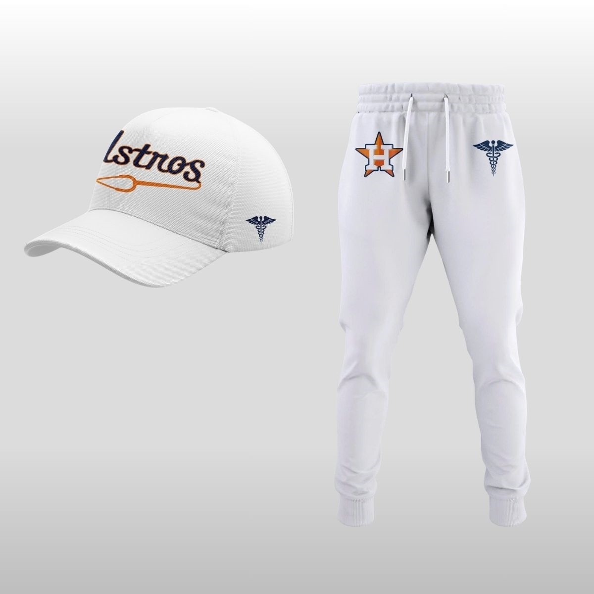 The design is a thoughtful departure from standard fan apparel, opting for a clean, professional “Medical White” base. Across the chest, the iconic “Astros” script is rendered in a warm navy and orange, while the sleeve features a subtle caduceus symbol—the universal emblem of medicine—integrated seamlessly with the team’s signature star. It’s a look that balances athletic energy with the dignity of the healthcare profession.