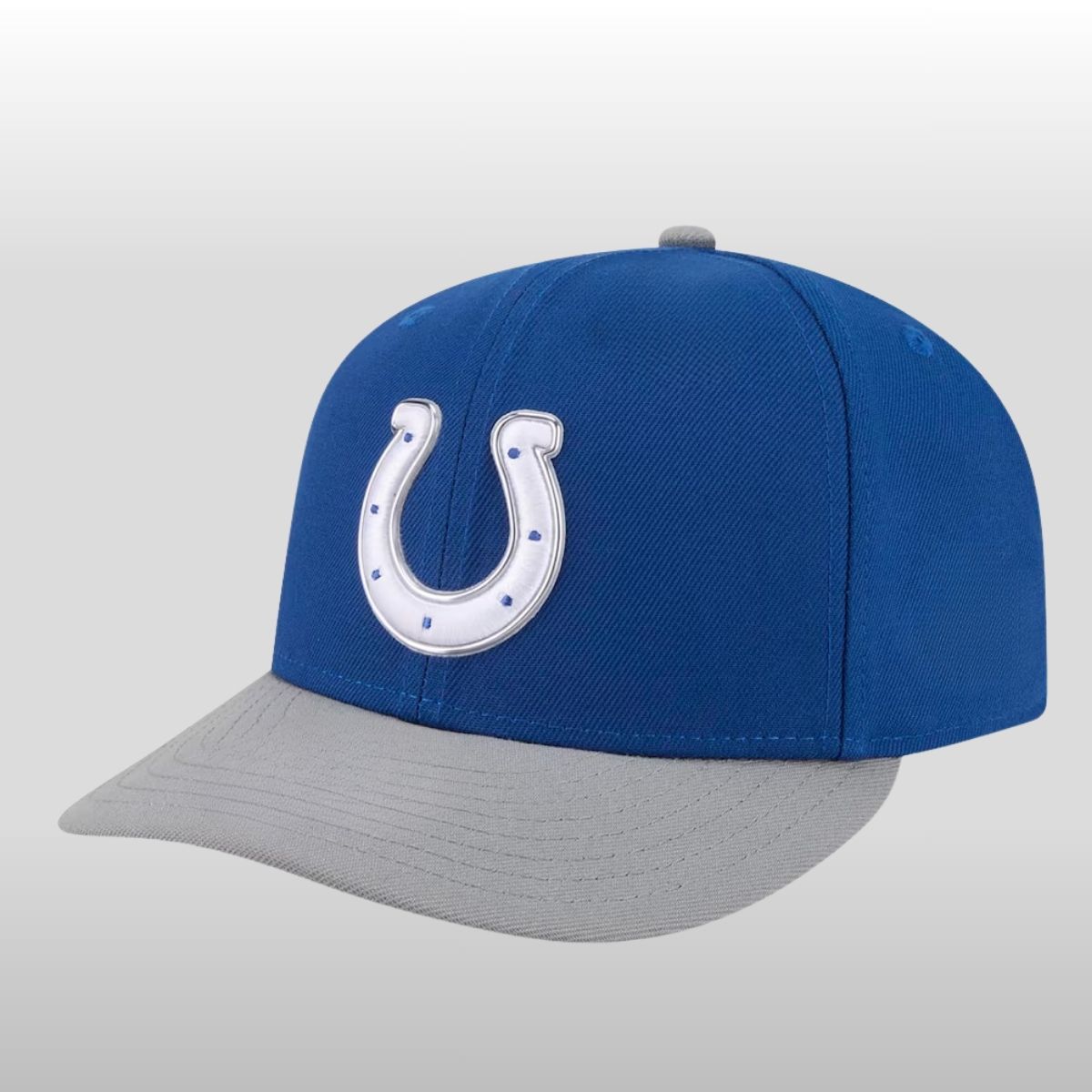 The design is a masterclass in subtle contrast. The crown is bathed in the team’s signature royal blue, providing a bold backdrop for the iconic horseshoe logo. Unlike traditional flat embroidery, the logo on this edition features a reflective liquid chrome outline, giving it a metallic shimmer that catches the light from every angle. This futuristic touch is grounded by a sleek, dark heather gray visor, creating a two-tone look that transitions perfectly from the stadium to a casual night out.