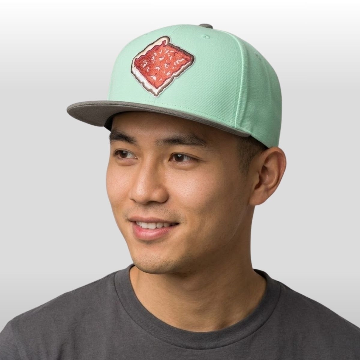 This distinctive cap showcases a mint green crown paired with a contrasting earthy brown brim, creating a soft yet grounded color palette. The centerpiece is a detailed, embroidered slice of tomato pie, complete with vibrant red sauce and a golden-brown crust. It is an ideal pick for those who want to display their local pride through a lens of creativity and fun, moving away from IronPigs traditional logos toward something much more appetizing.