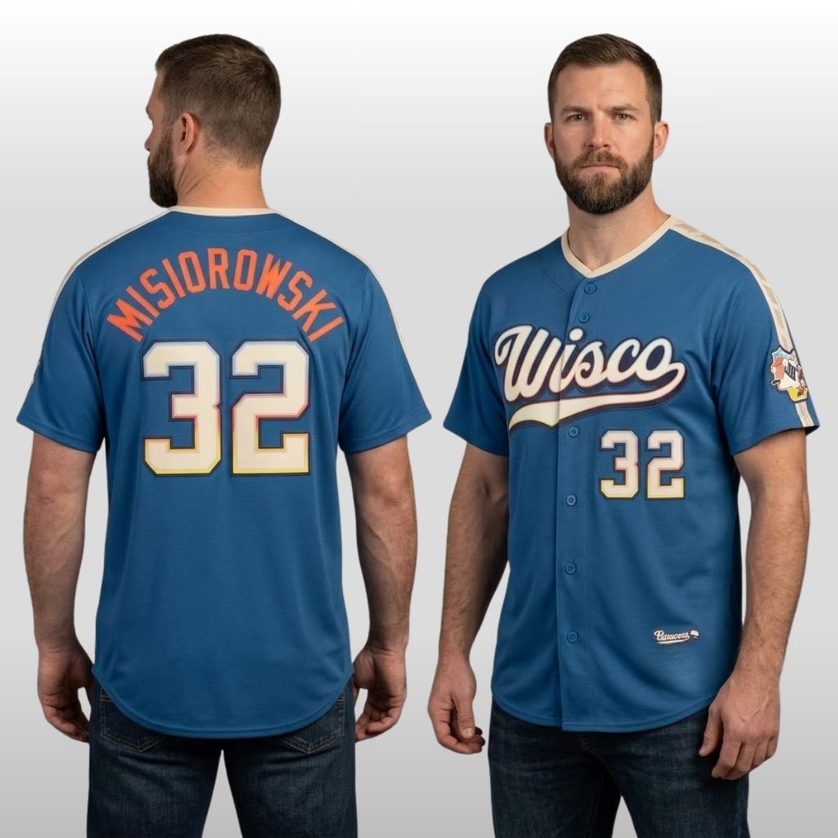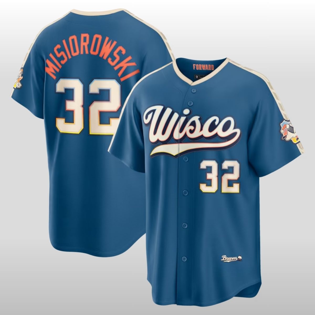 This striking piece of fan apparel features a rich navy base accented by warm cream and yellow tones. The front showcases the stylized “Wisco” script in a vintage-inspired font, celebrating the state’s nickname with pride. With Misiorowski’s name and number 32 prominently displayed on the back, this design perfectly balances the energy of a rising star with the timeless spirit of the Brew City community.