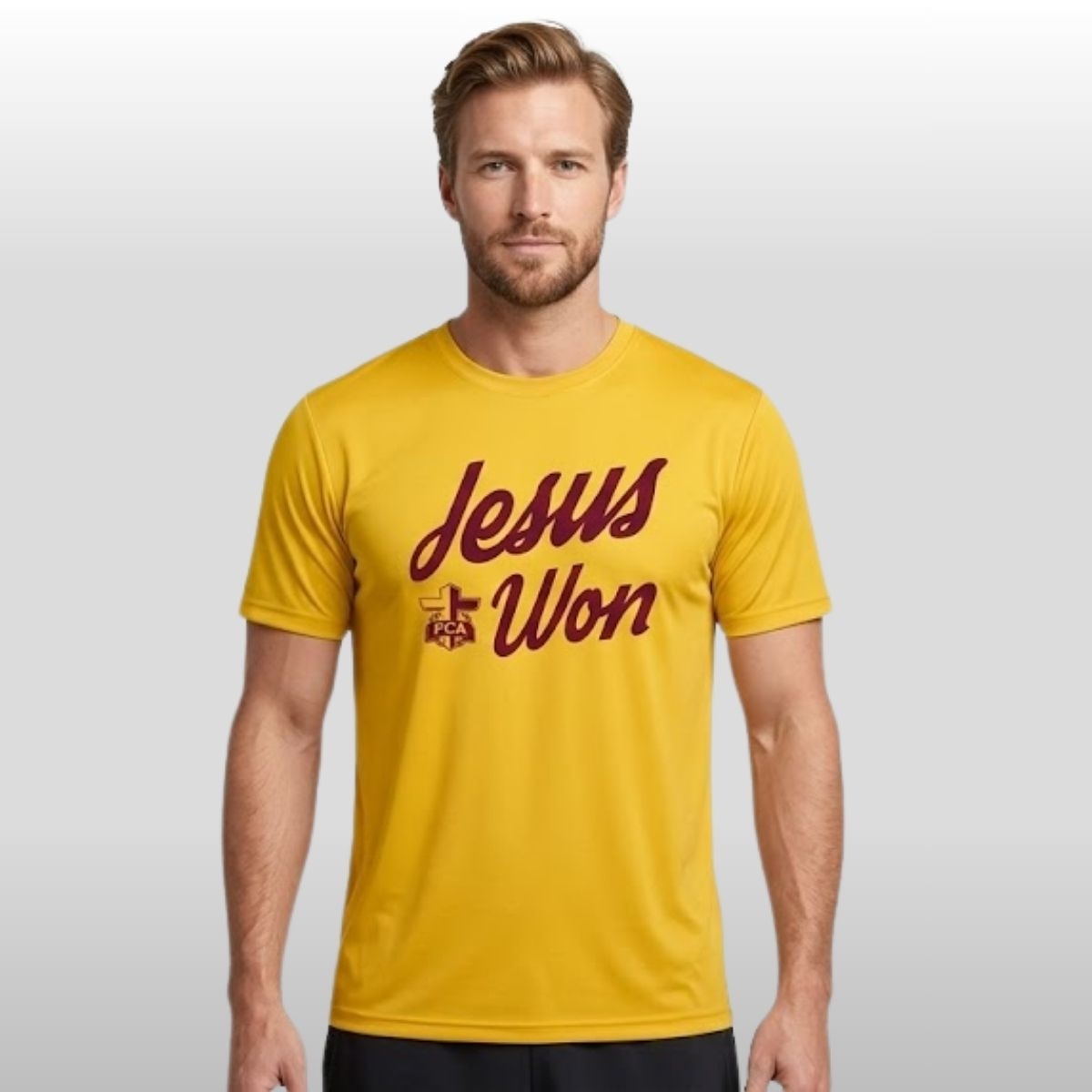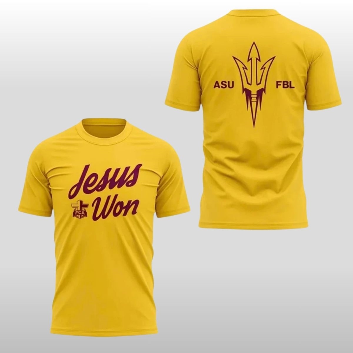 The design utilizes a striking “Gold” base—a hue synonymous with the heat and resilience of the Valley—providing a vibrant backdrop for the deep maroon graphics. On the front, the script “Jesus Won” flows with an elegant yet powerful energy, accompanied by the Fellowship of Christian Athletes (FCA) emblem. This pairing creates a visual testament to the idea that while scores on a scoreboard fluctuate, certain victories are eternal. It is a piece that resonates deeply with students, alumni, and local supporters who find strength in both their community and their beliefs.