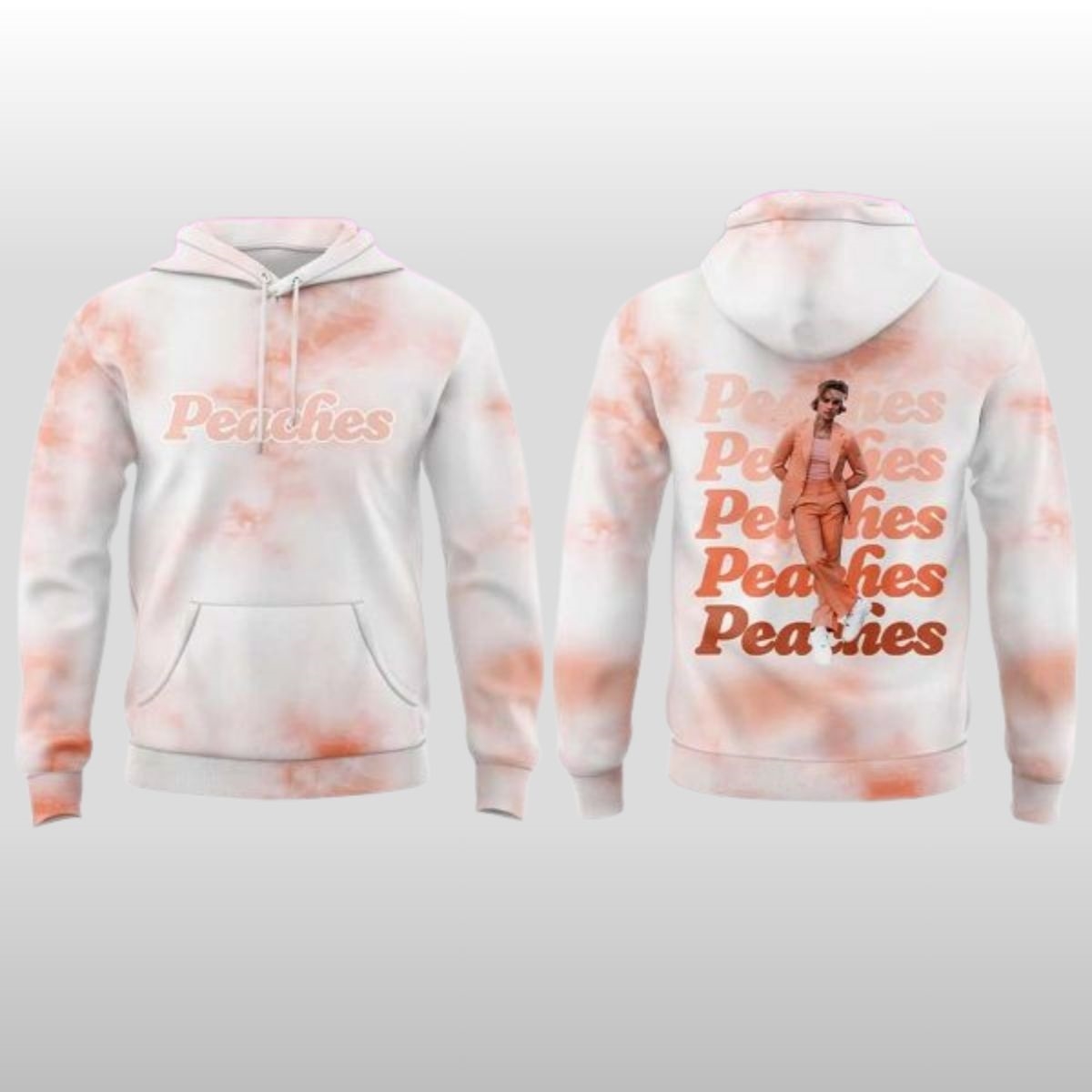 The design of this hoodie serves as a visual love letter to the sunset skies of California. The fabric features a soft, cloud-like tie-dye pattern that transitions through shades of creamy white and warm apricot, mimicking the natural glow of a Coachella Valley dusk. On the front, the word “Peaches” is emblazoned across the chest in a stylized, retro-inspired cursive font. The lettering is rendered in a soft peach hue with a subtle white outline, giving it a playful 3D effect that pops against the marbled background. On the back, the storytelling continues with a high-definition graphic of the artist himself, dressed in a sharp peach suit that contrasts beautifully against five repeating “Peaches” logos stacked in a gradient of earthy oranges and browns.