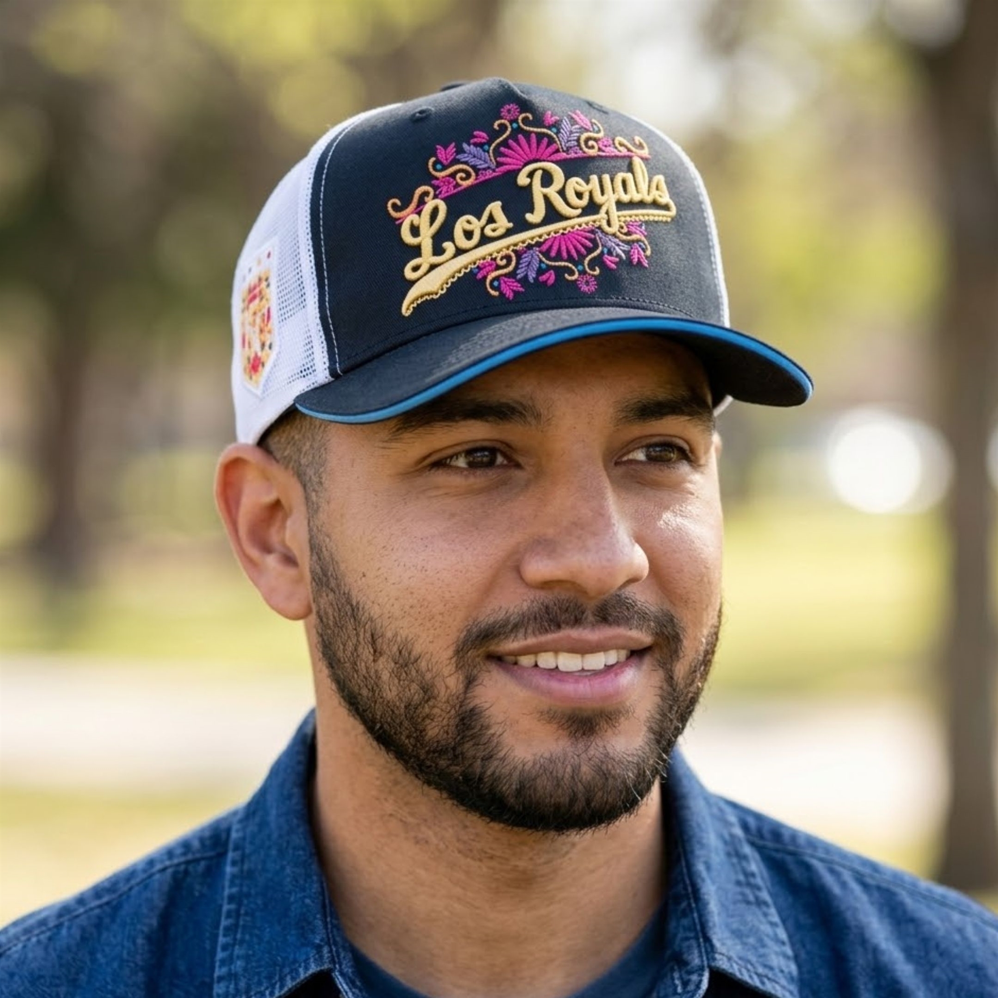 This year’s giveaway piece is a stunning departure from standard stadium gear, opting for an intricate, artisanal aesthetic. The crown features a deep midnight navy base, providing a sharp contrast for the centerpiece: the “Los Royals” script. Rendered in a rich, raised gold embroidery, the lettering sits atop a flurry of traditional floral patterns.