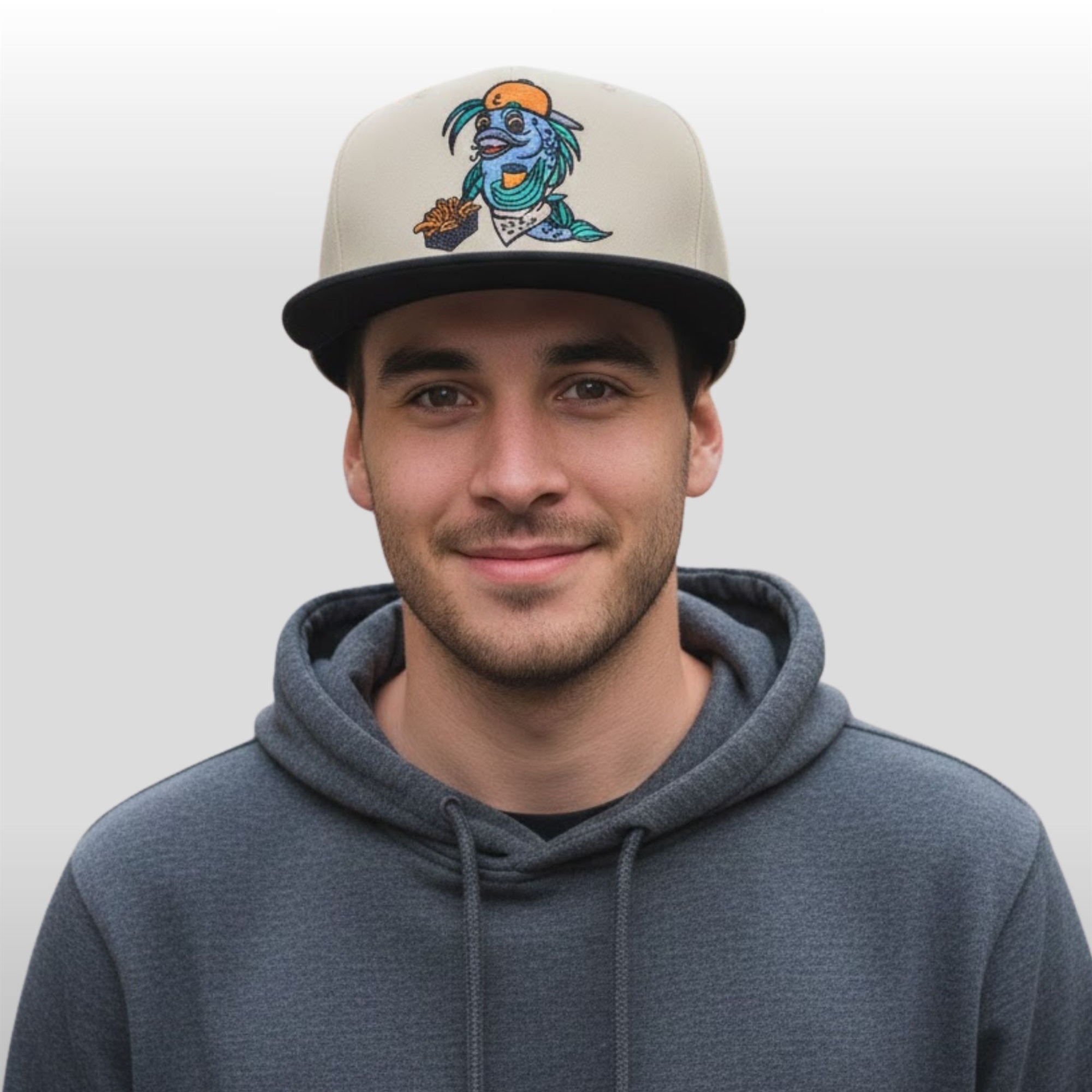 The design of this hat is a masterclass in quirky, nautical aesthetics. It features a clean, cream-colored crown paired with a sharp black brim, providing a neutral canvas that makes the centerpiece artwork truly “pop.” The front displays a charismatic, cartoon-style fish character, decked out in its own tiny orange cap and a stylish bandana, holding a fresh basket of golden-brown fries.