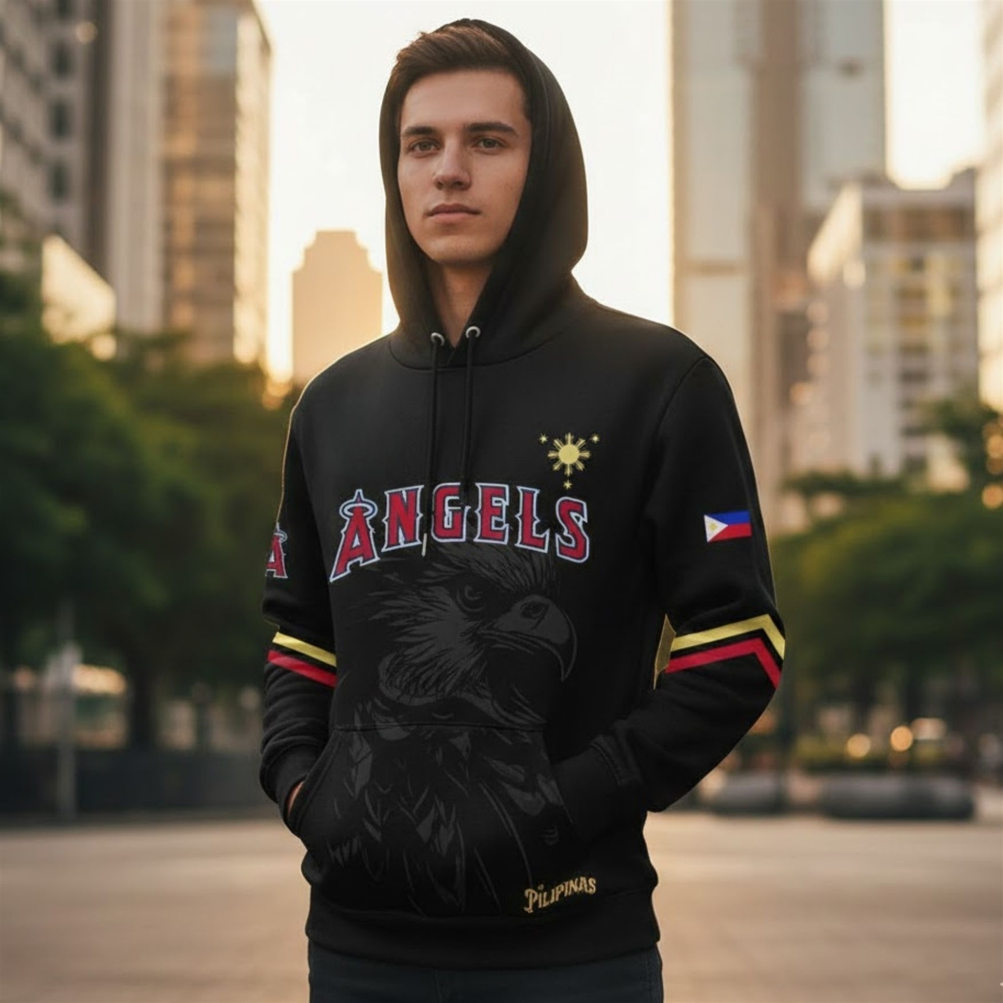 This hoodie is a masterclass in storytelling through apparel. It breaks away from standard team gear to embrace a palette that honors the Philippine flag. The front features the “ANGELS” lettering in a bold, collegiate style, accented by the iconic sun and stars. This design choice pays homage to the spirit of the community while maintaining the classic aesthetic fans love.