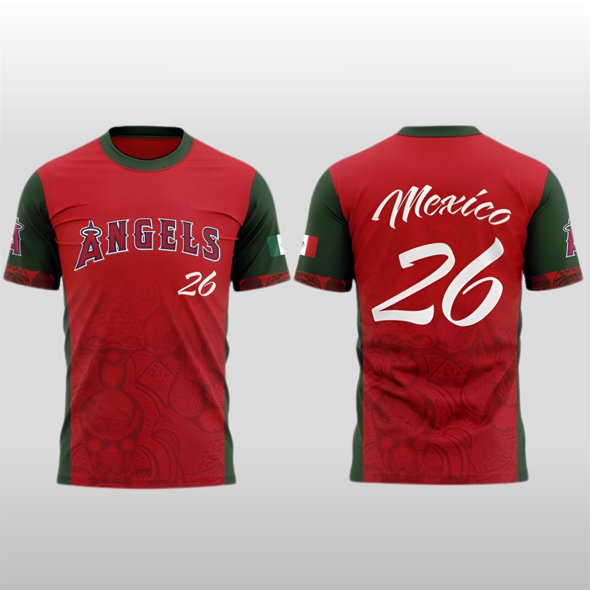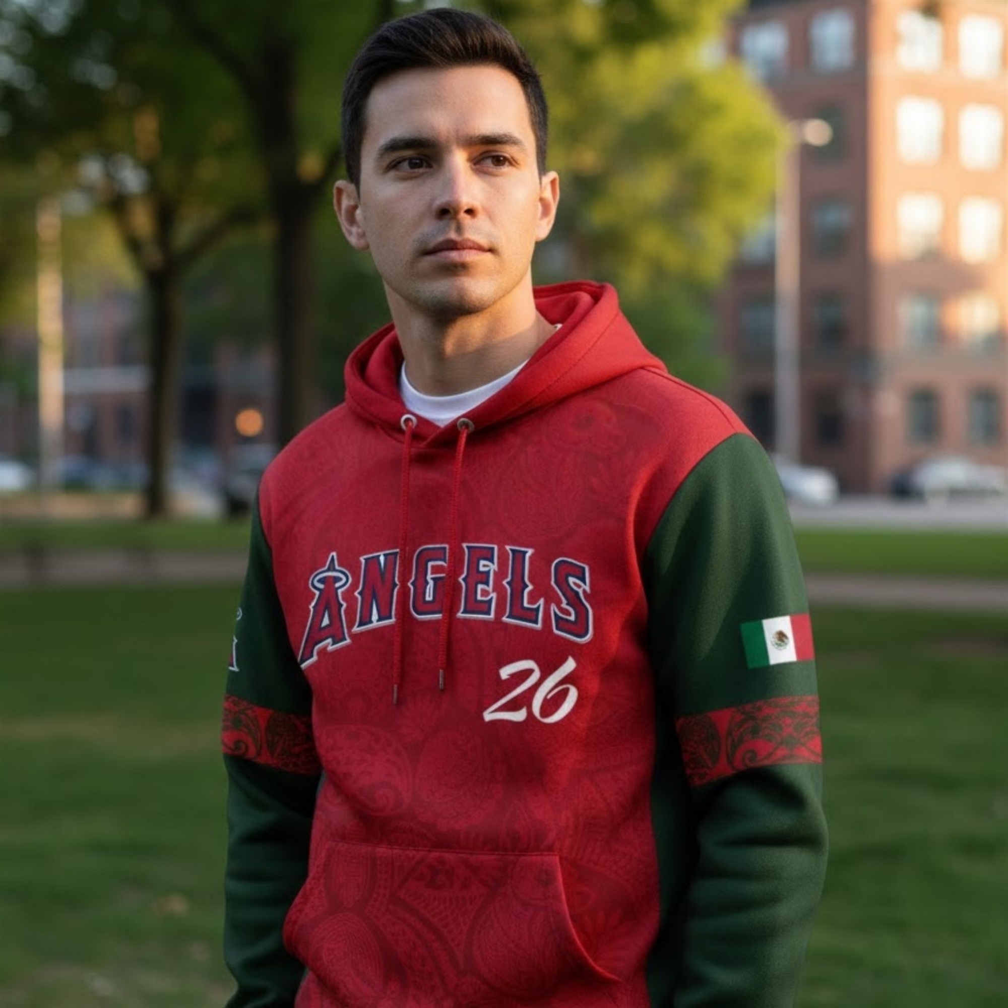 This hoodie shirt is a masterclass in thematic design. It breaks away from standard team gear to embrace a bold color palette inspired by the Mexican flag—deep forest green sleeves contrasting against a striking scarlet red body. The front features the iconic “ANGELS” typography in a classic varsity style, accented with subtle Aztec-inspired patterns ghosted into the fabric. This choice pays homage to ancestral roots while maintaining a sleek, contemporary streetwear silhouette.