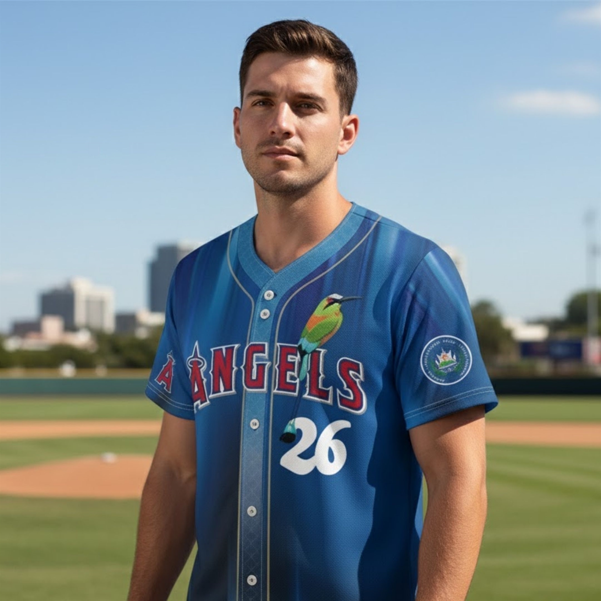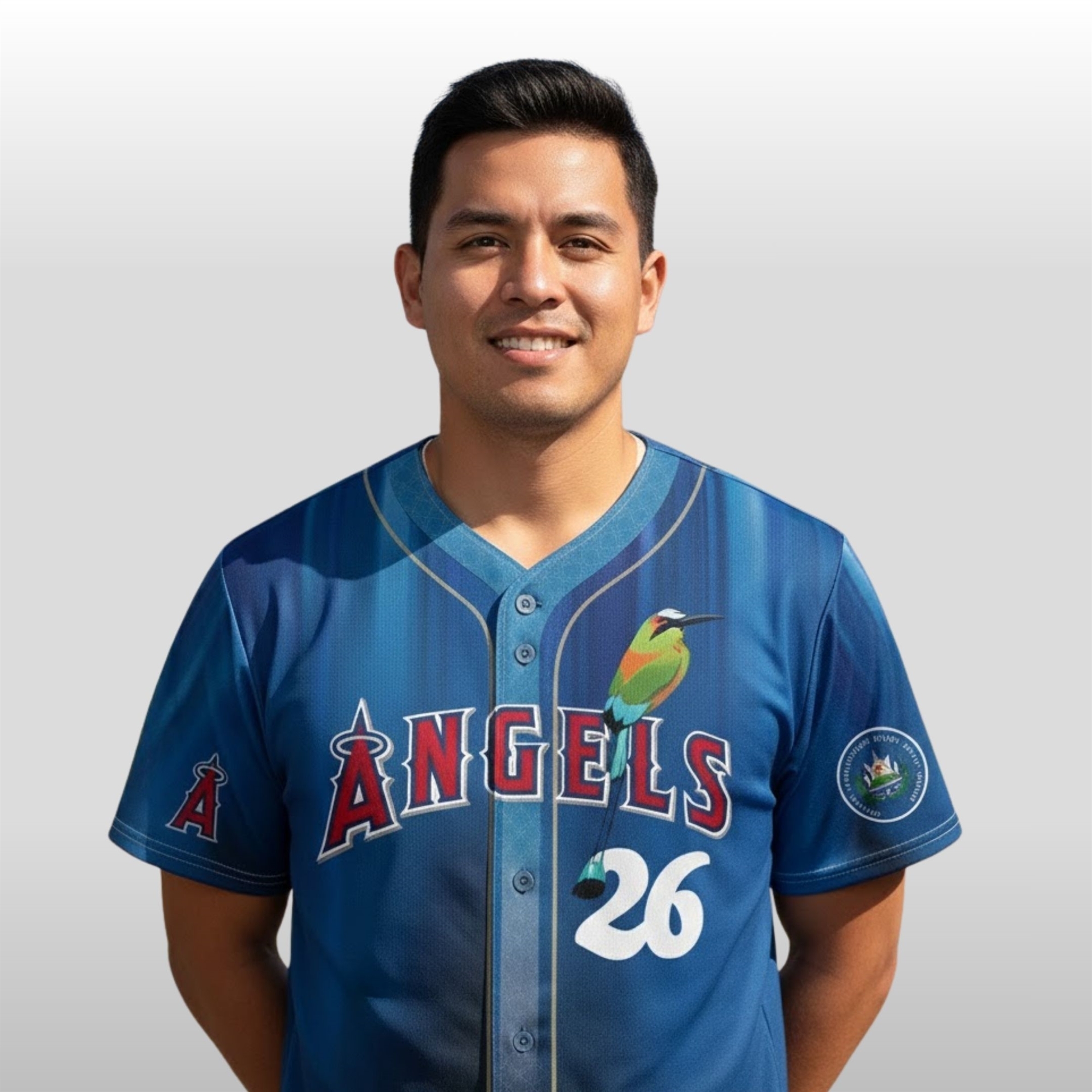 This jersey is a stunning visual celebration of identity. Moving away from the standard red and white, this design features a breathtaking gradient of deep ocean blue and sky blue, mirroring the colors of the Salvadoran flag. The front displays the classic “ANGELS” script in a bold, textured red, accompanied by a beautifully detailed Torogoz—the national bird of El Salvador—perched elegantly on the lettering.