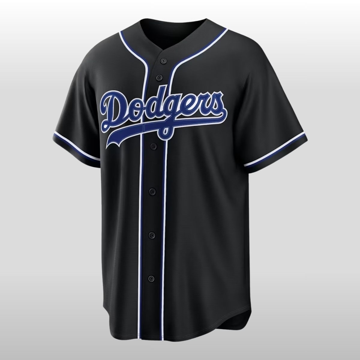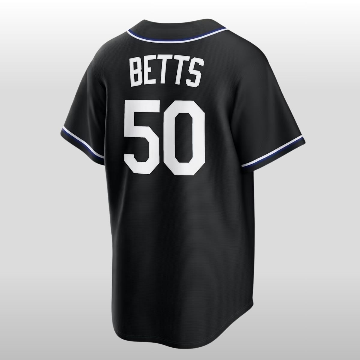 The sleek aesthetic of modern sports fashion has reached a new peak with the latest release for Los Angeles fans. This jersey commemorates a standout era for the franchise, specifically celebrating the influence of superstar Mookie Betts. The garment features a striking “Black Out” base, providing a sharp contrast to the iconic “Dodgers” script across the chest. The lettering is meticulously crafted in a deep royal blue with a crisp white outline, creating a 3D effect that pops against the dark fabric. This specific design gained massive traction during the 2026 fan-appreciation events, where the “treeing” trend—where fans layer high-fashion streetwear with sports gear to create a “canopy” of style—took over social media.
