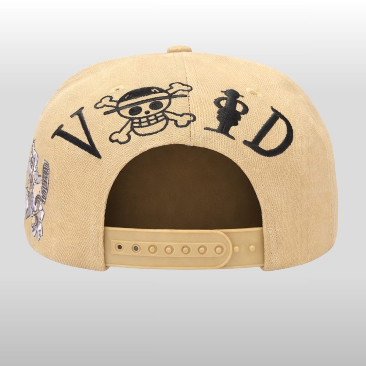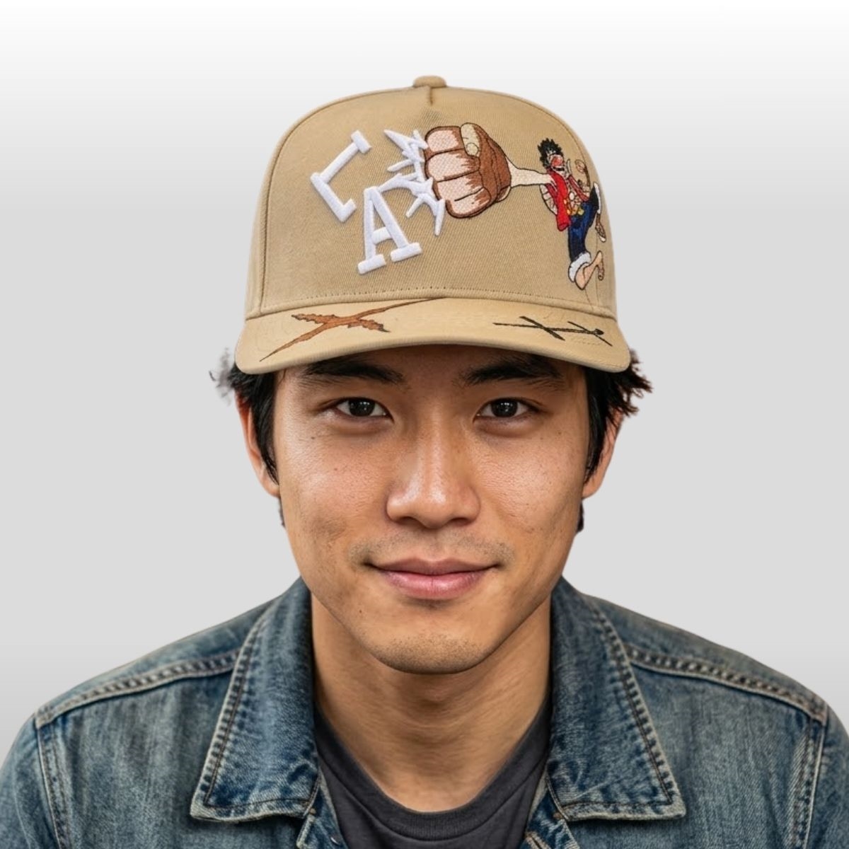 The design of this piece is a masterclass in dynamic storytelling through embroidery. Built on a premium sand-toned canvas, the front panels feature a high-relief “LA” logo that appears to be shattering under the immense pressure of a “Gomu Gomu no” punch. Monkey D. Luffy himself is depicted in mid-action, his arm stretching across the side panel to deliver a strike that bridges the gap between animation and reality. The stitching is dense and textured, ensuring that the vibrant red of Luffy’s vest and the crisp white of the fractured lettering stand out with a 3D effect that catches the light from every angle.